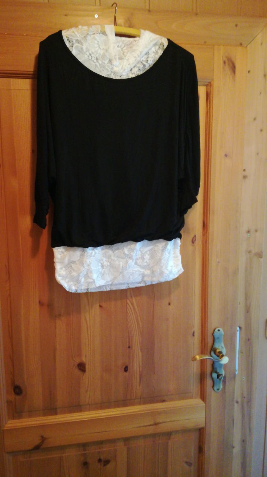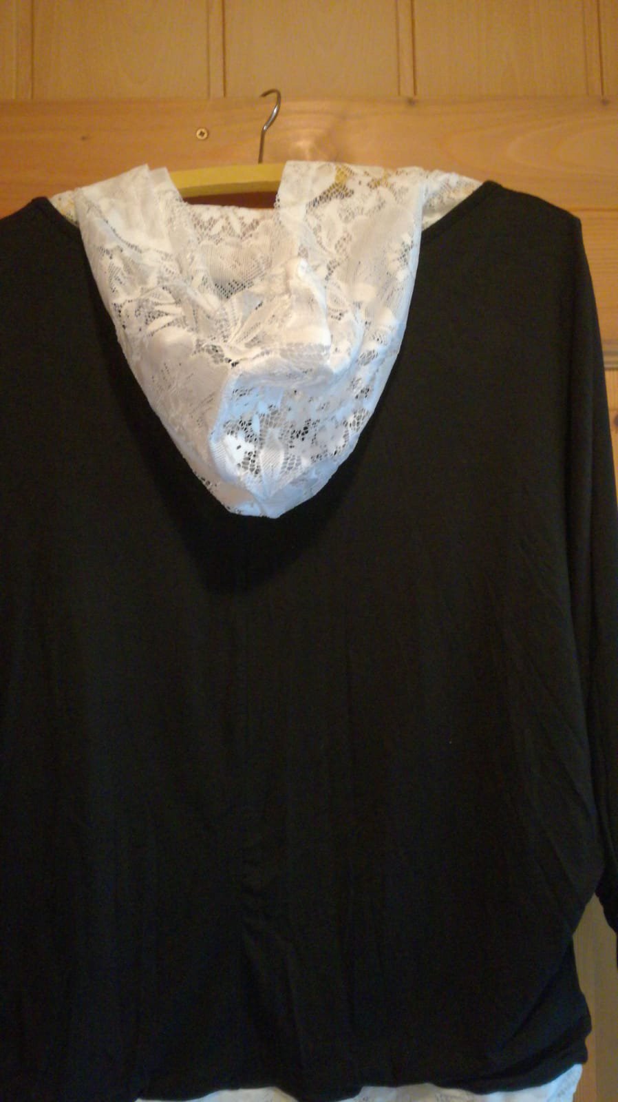 Biete dieses raffinierte Shirt mit Fledermaus Ärmeln, einer Kapuze die aus Spitze besteht, an der Schulter offen ist und einem Saum Abschluss, der ebenfalls aus der weichen Spitze besteht. Ein richtiges Traum Teilchen. Die Gesamtlänge beträgt ca. 68cm.