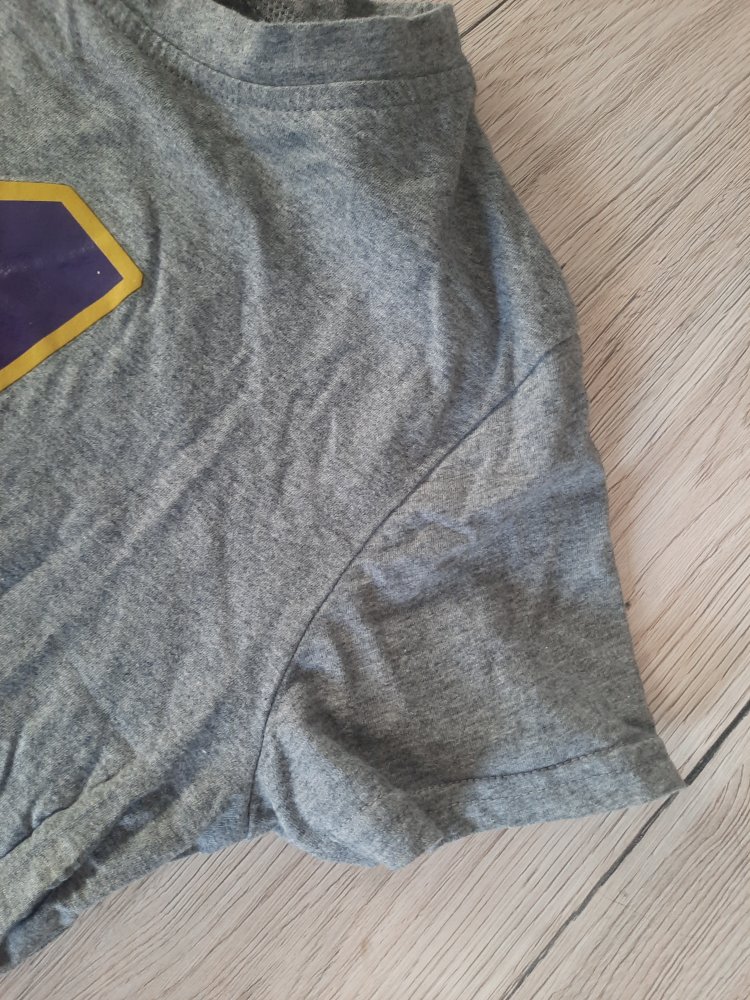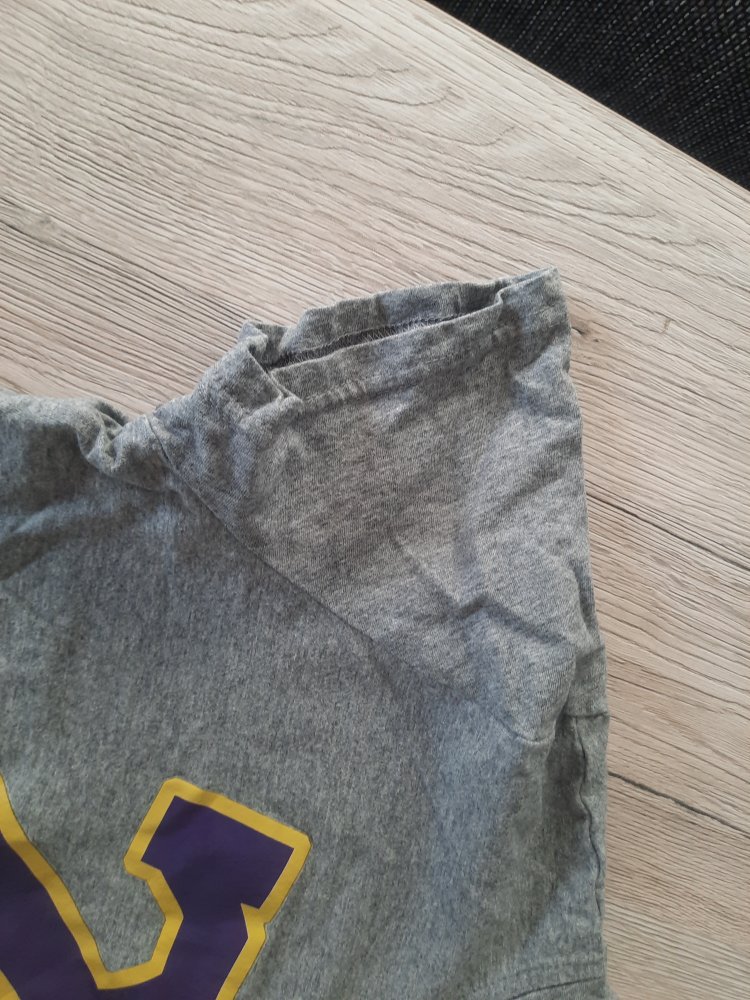 Dunkler Fleck auf der Vorderseite unten, siehe Bild. Nähte unter rechter Achsel kommen raus, siehe Bild. Aufdruck hat an ein paar Stellen weiße Punkte. Ansonsten guter Zustand.
