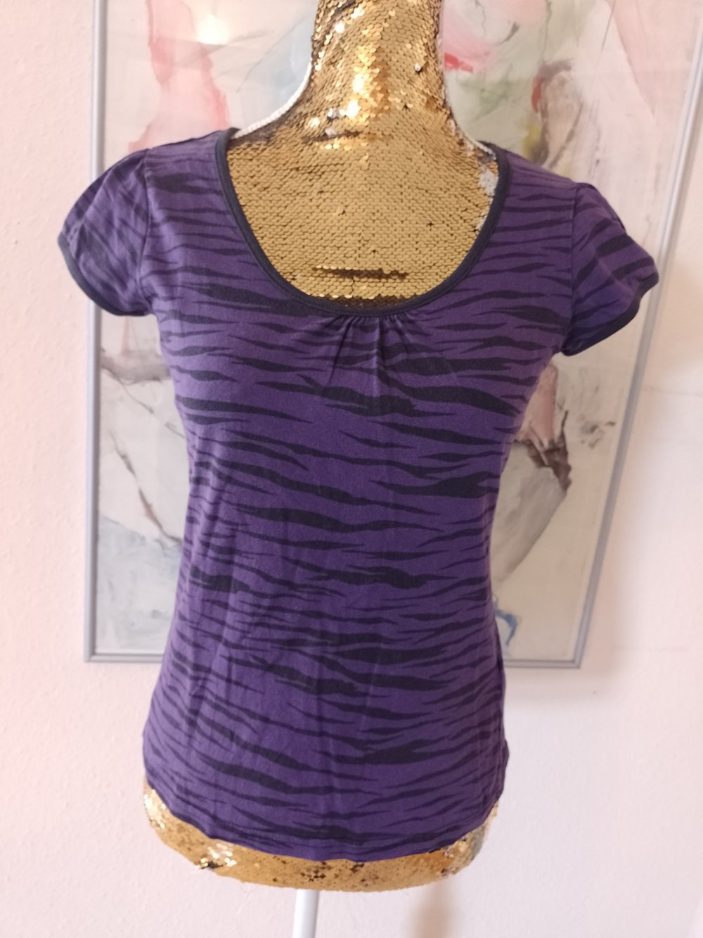 lilafarbenes T-Shirt mit Silberprint und Rückenausschnitt Gr. 36