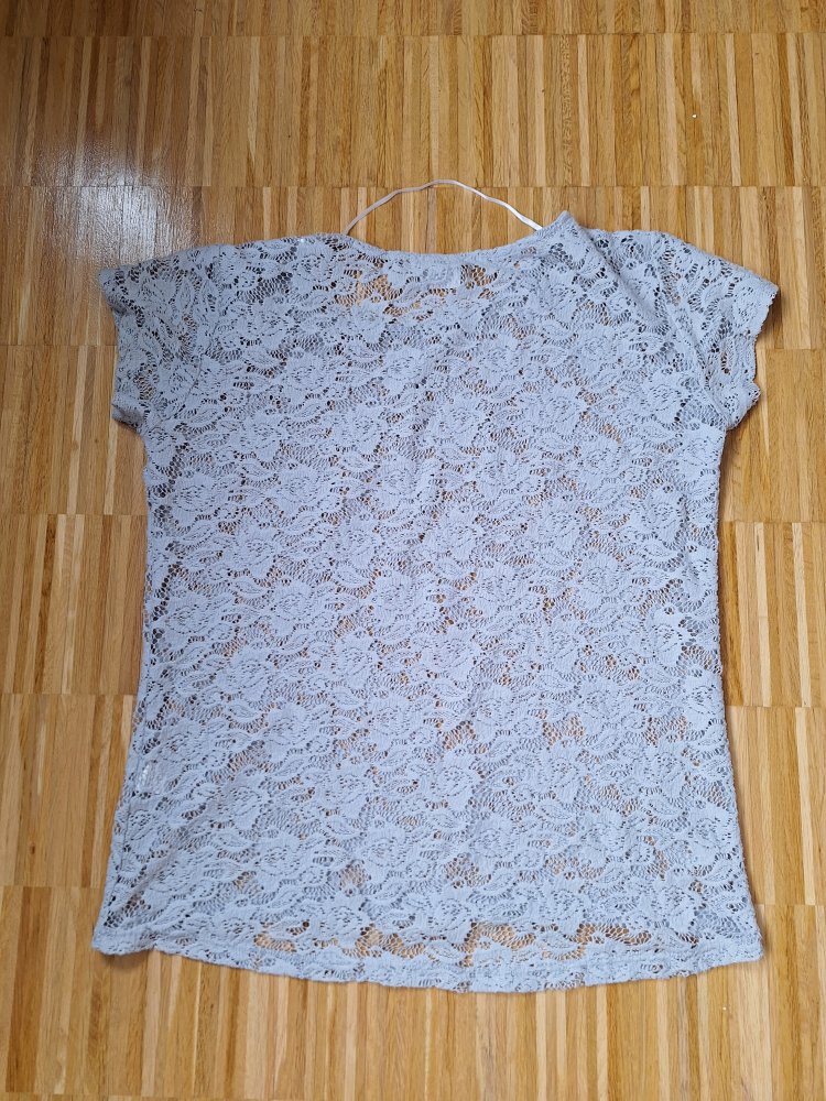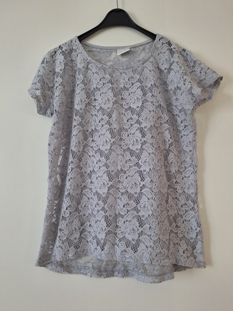 Schönes graues T-Shirt mit transparentem Spitzen-Blumenmuster, Gr. M.