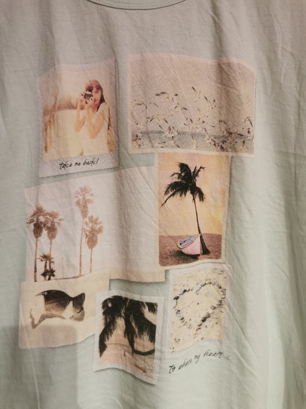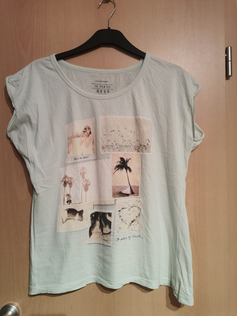 Ich biete dieses T-Shirt an. Es ist mintgrün, hat ein Print als Bildercollage und hat die Größe 48. Das T-Shirt hat im Achselbereich minimales Pilling. Im Bereich der Hüften und im unterem Rücken ist etwas mehr Pilling vorhanden.