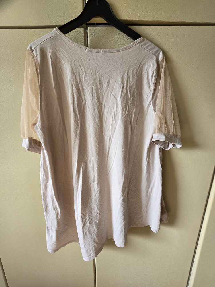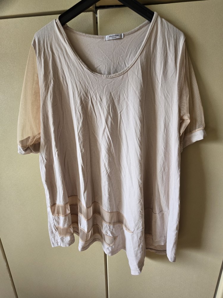 Shirt von der Lagenlookmarke moonshine. Die Farbe ist Beige und es ist an sich eher schlicht. An den Ärmeln und an dem unteren Bereich sind netzartiger Stoff eingearbeitet. Sehr luftig und locker.