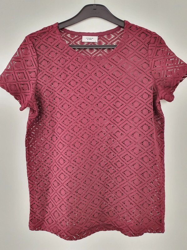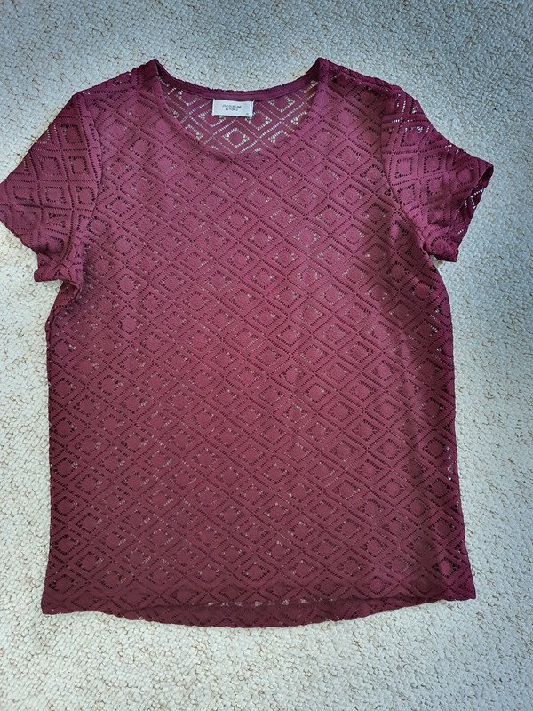 Etwas durchsichtig wegen der Maschen. Weicher Stoff. Die Farbe ist eher wie auf dem ersten Foto, also dunkelrot. Sehr selten getragen.