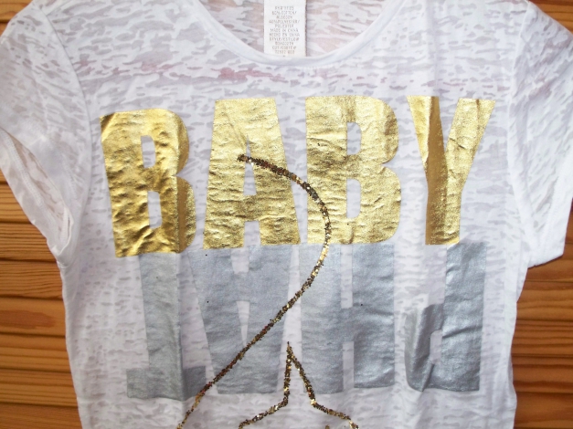 Leichter Stoff, mit Gold-Pailletten und goldener und silberner Schrift vorne. Der Stoff ist leicht transparent.
