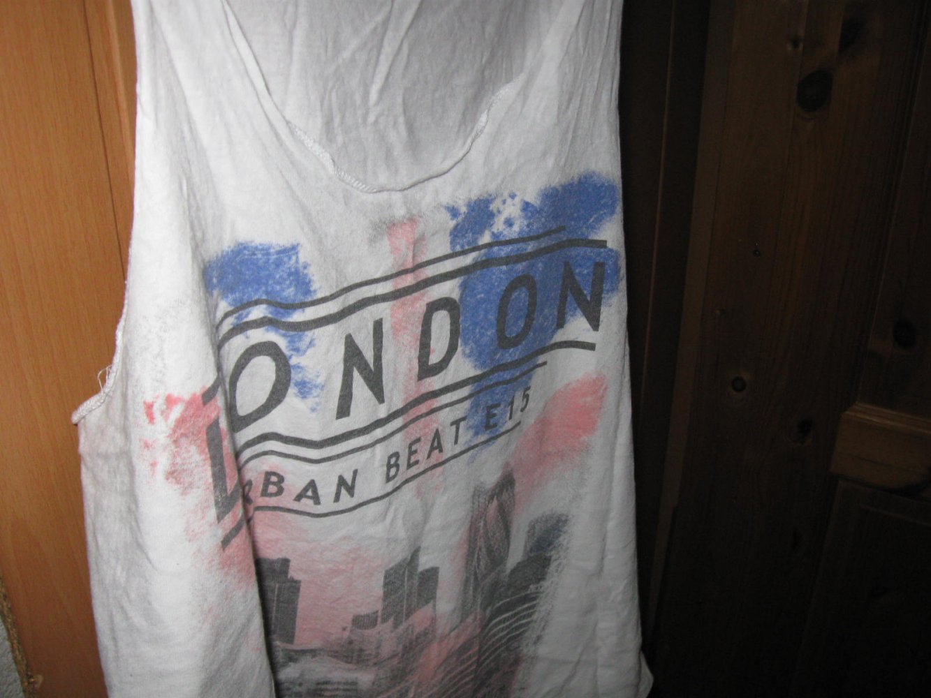 Biete dieses oft getragene Shirt mit Brust Druck. Dieses Shirt ist etwas aus der Form geraten. Hier noch einige Maßangaben: