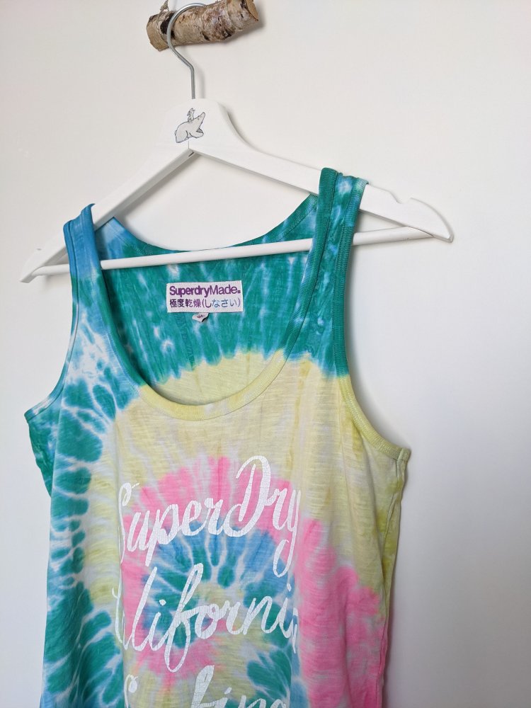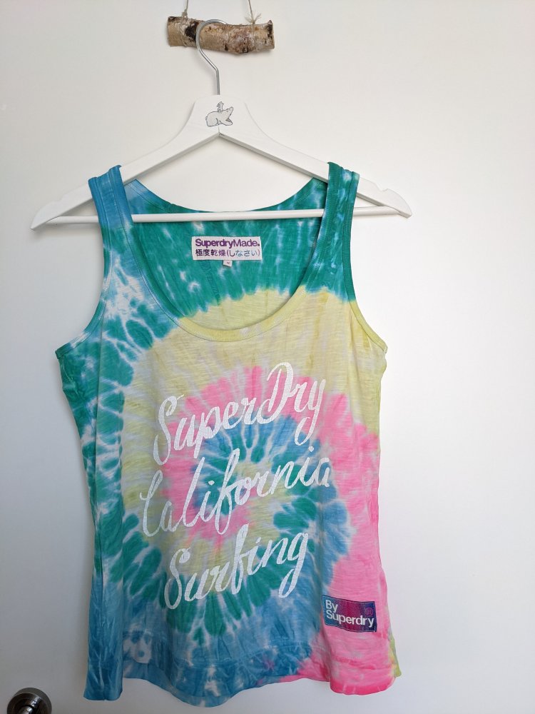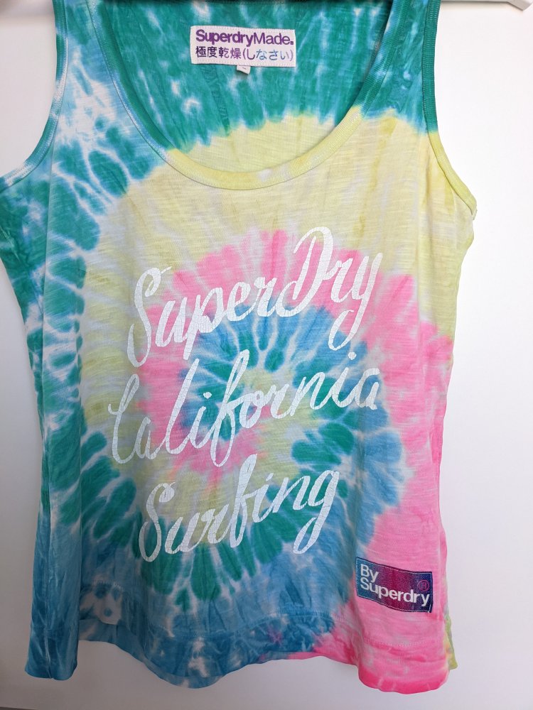Tolles, farbenfrohes Sommershirt von Superdry. Die Schrift vorne ist etwas brüchig, ich kann aber nicht sagen, ob das von Anfang an so war, oder erst mit der Zeit so geworden ist. Es passt jedenfalls zum Shirt. (Ansonsten) keine Mängel vorhanden.