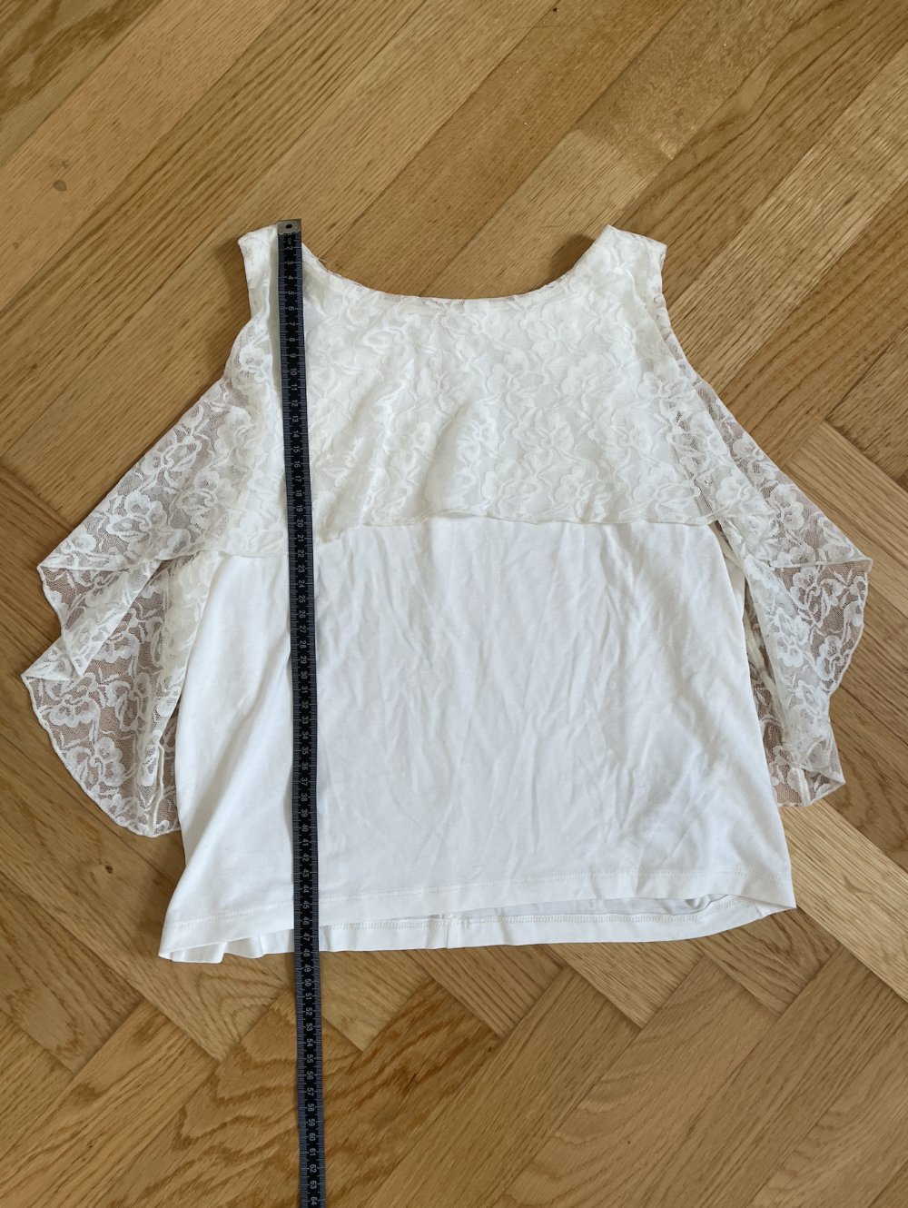 Weißes Shirt, Richtung Creme, mit floraler Spitze. Es ist doppellagig, wobei die Spitze oben drapiert ist. Hinten hat es einen kleinen Schlüssellochausschnitt. Ungetragen
