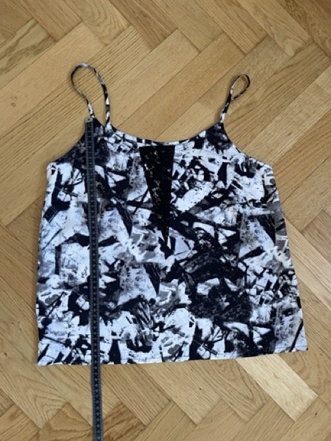 Ungetragenes Top in Schwarz-Weiß von Noisy May. Vorn hat es einen schönen Zierausschnitt mit Spitze.