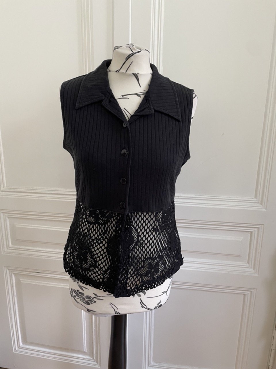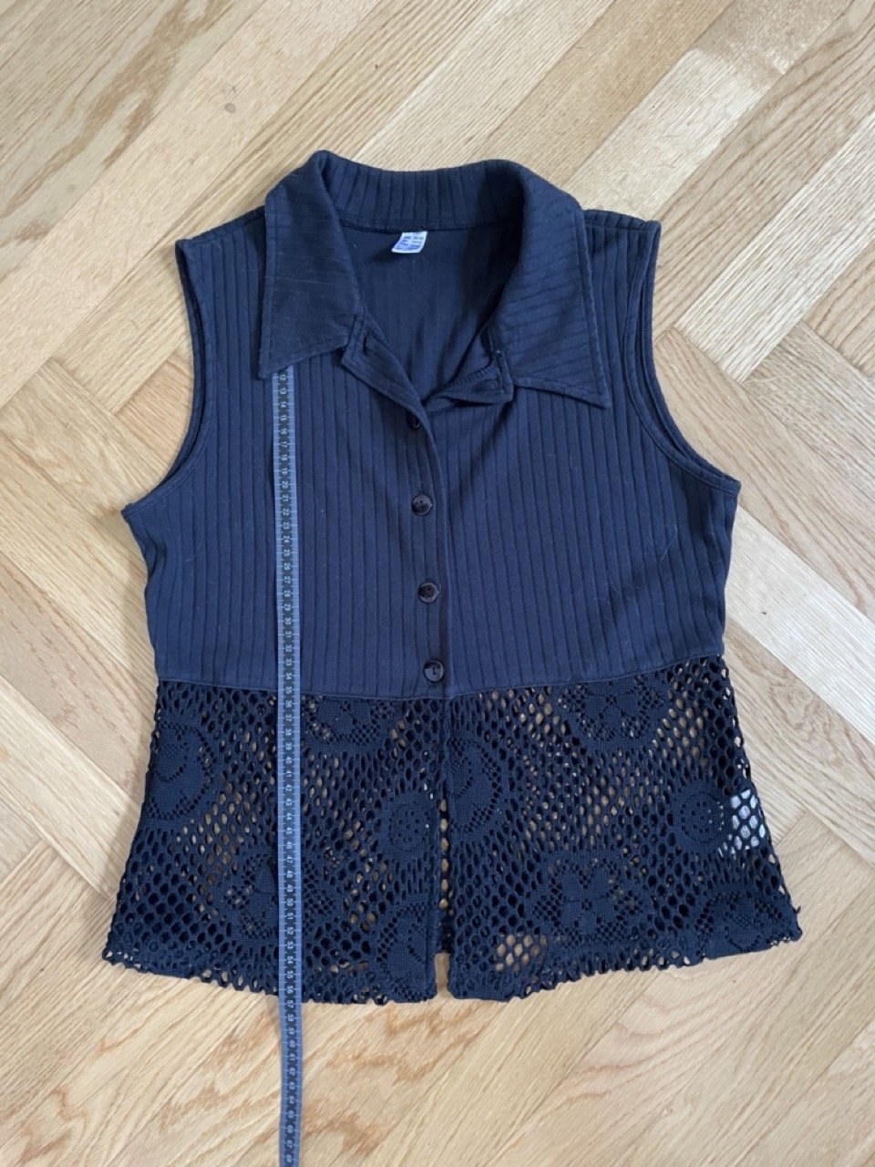 Besonderes Top mit Kragen und floralem Häkeleinsatz. Dadurch, dass der untere Part transparent ist, ist es im Grunde ein Crop Top :D Oben gibt es Knöpfe zum Schließen, etwa ab Höhe des Bauchnabels fallen die beiden Seiten dann locker herunter ohne extra verschlossen zu sein.