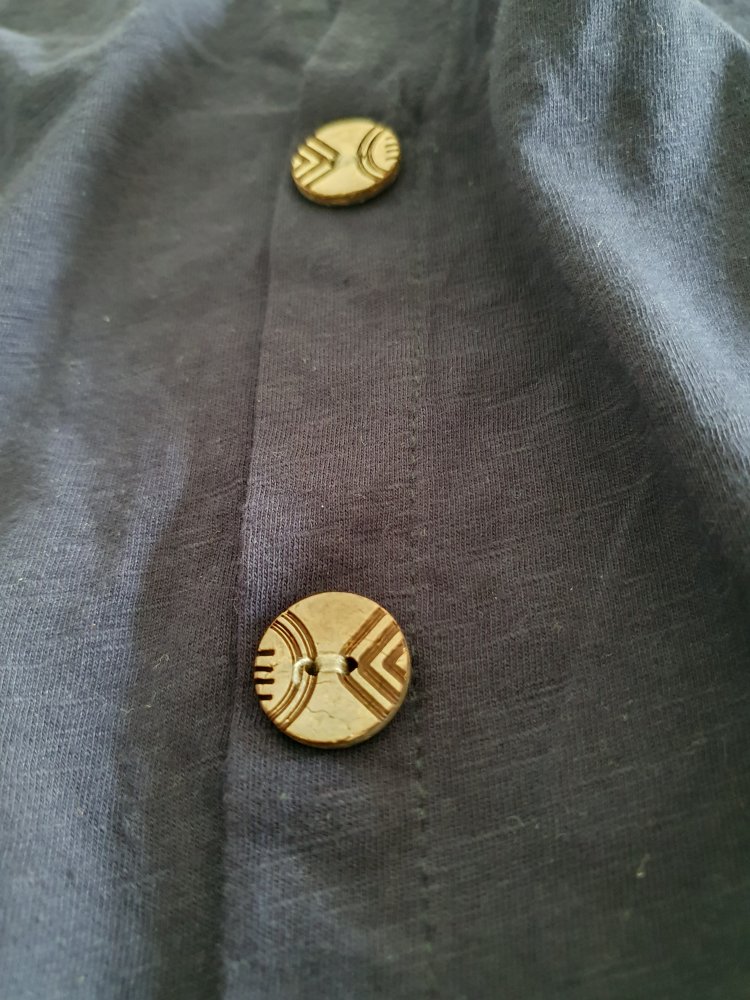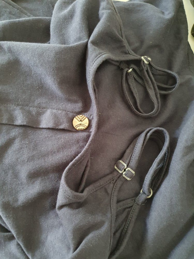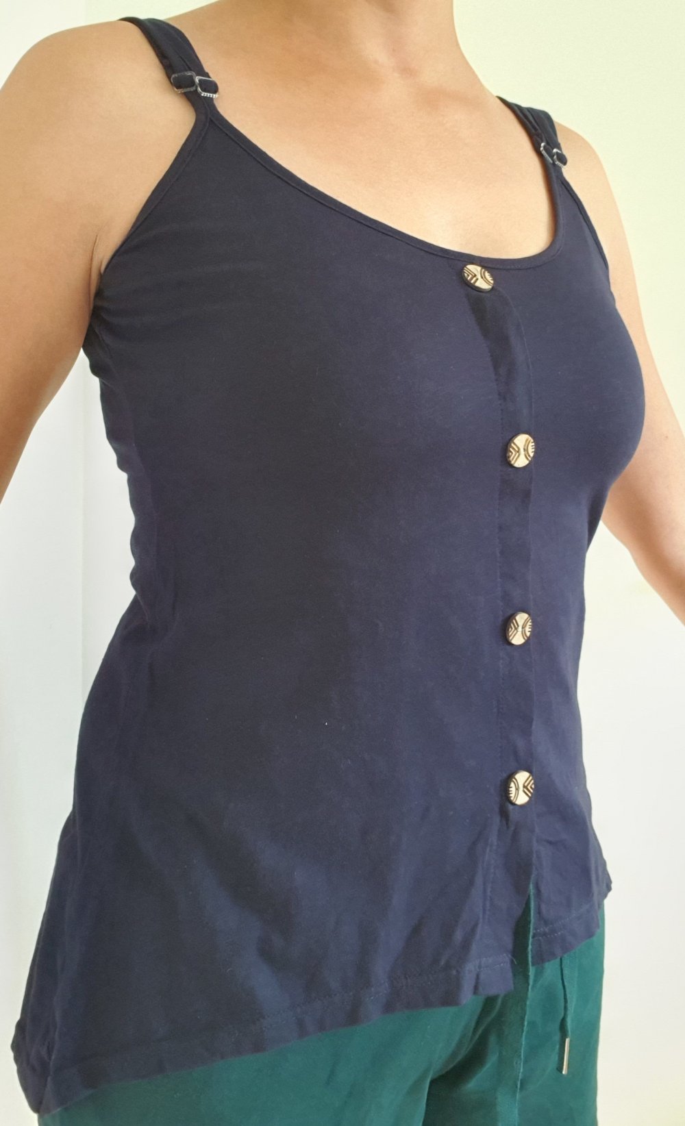 Sommeroberteil in tiefem Dunkelblau mit gemusterten Holzknöpfen und 4 verstellbaren Spaghetti-Trägern pro Schulter (siehe Fotos). Hinten länger als vorn.