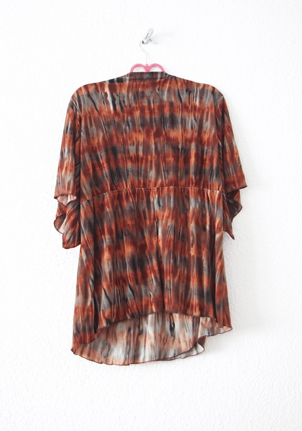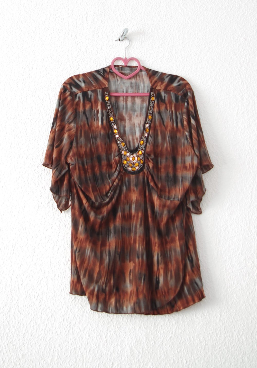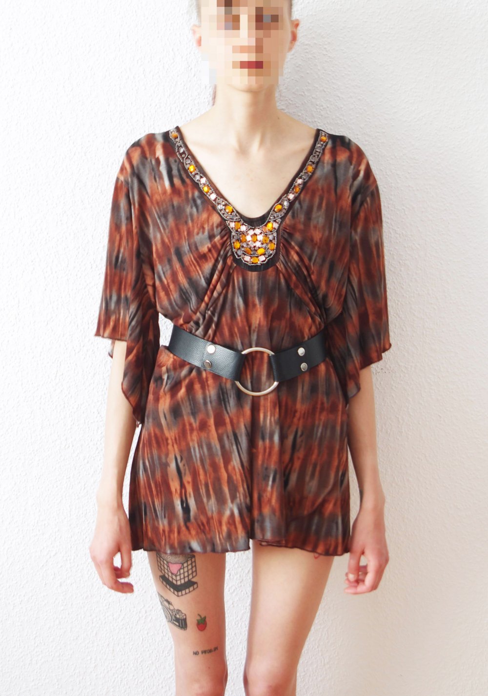 Braun grau gemustertes Hängerchen/Tunika (interessantes Tie Dye Muster) aus einem weich fließenden, luftigen, stretchigen Stoff. Mit weiten Ärmeln und tiefem Ausschnitt, dort von Hand bestickt mit Perlen und Steinen. Leicht tailliert, aber weit fallend (oversized). Perfekt kombiniert mit einem breiten Taillengürtel. Toll für Alltag, zu Festivals, Goas und generell Elfen- und Lagenlook. Betont sehr vorteilhaft die Figur. Bei einem Designmarkt erworben, der Name des Labels ist mir leider entfallen, da ich das kratzende Schildchen entfernen musste. 2Mal getragen, in neuwertigem Zustand.
