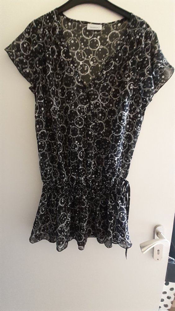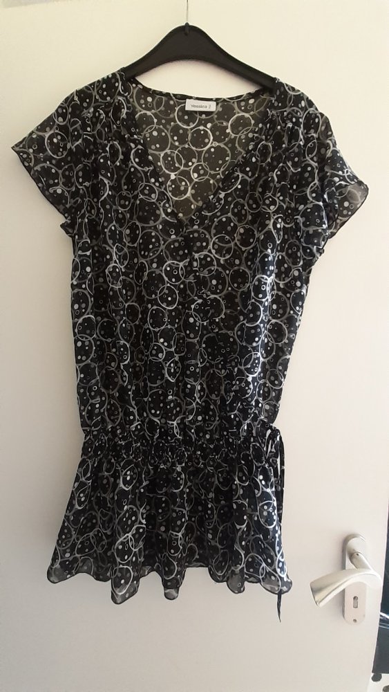 Tunika transparent mit Punkte, Kreise und Kringel, schwarz grau silber mit etwas Glitzer. Kurze Ärmel, Länge ab Schulter ca. 77 cm. Durch den Gummizug kann man das je nach Wunsch und belieben etwas höher ziehen. Verschiedene Tragemöglichkeiten.