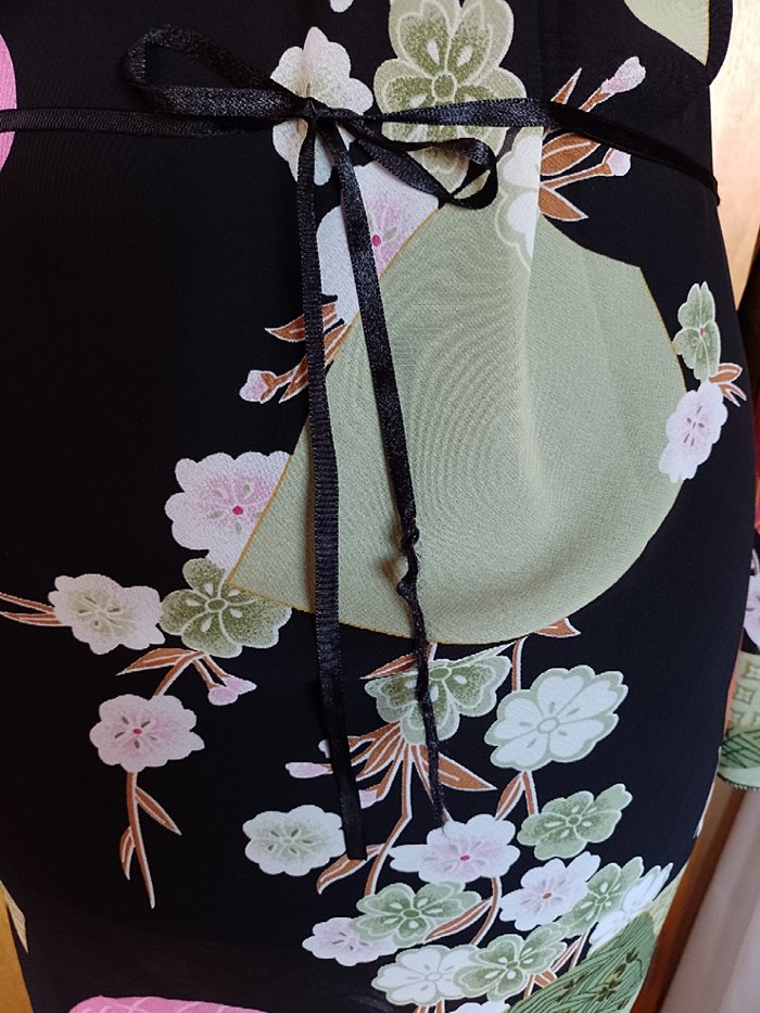Die Tunika ist asymmetrisch geschnitten, hat einen Rundhalsausschnitt ausgestellte, lange Ärmel und ist transparent. Seitlich sind kleine Bändchen zum Binden angebracht.