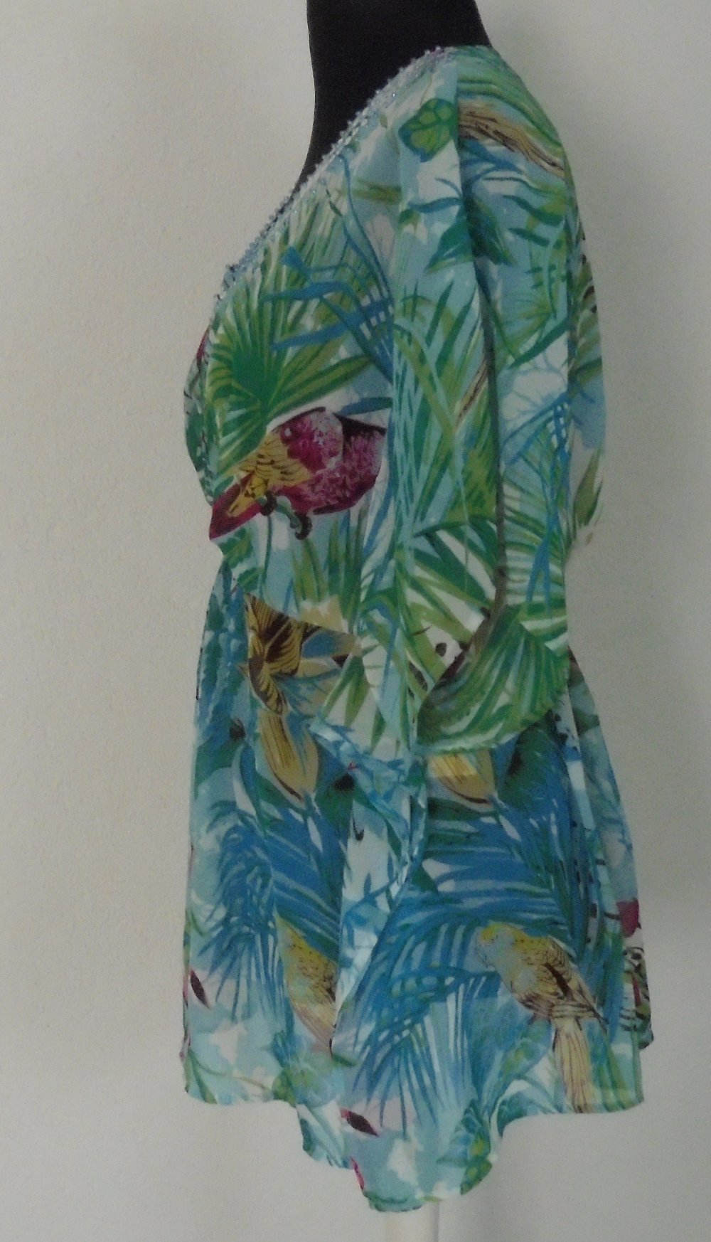 Die Tunika ist weit geschnitten, transparent, hat einen V-Ausschnitt und Gummizug in der Taille.