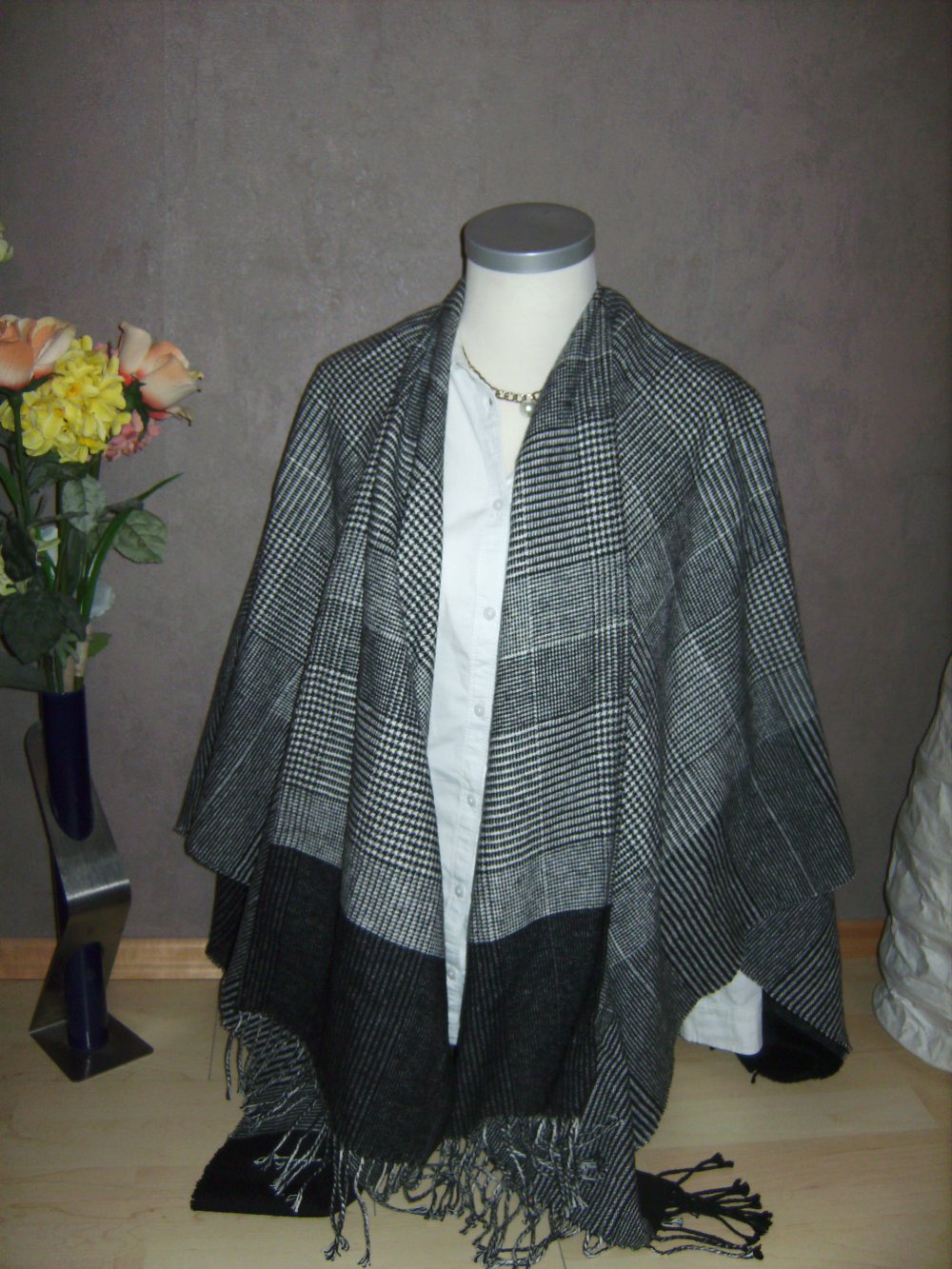 Überwurf-Poncho in XL-Größe: 170x80 cm. Tolles Tartan-Muster. Ein Plaid, vielseitig tragbar. Hahnentritt-Muster in royalem Karomuster. DER Zeitlose Klassiker, zu allen Outfit`s tragbar, auch zu Anzughose. Über Hemden und Shirts oder auch zusätzlich über Jeansjacke oder Blouson. Bei Bedarf auch Solo als XXL Schal zusammengelegt tragbar. Plus Versandkosten.