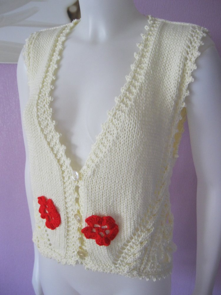 Ausgefallene Weste mit gehäkelten Applikationen.