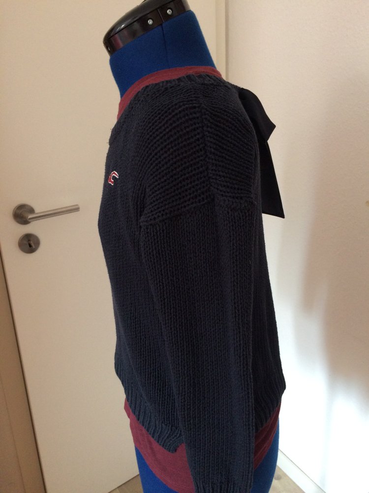 Weit geschnitten, kann auch von Größe M noch gut getragen werden. Mit Hollister Logo Schwalbe vorne an der linken Seite. Durch das luftige Maschengewebe kann der Pulli auch an Sommerabend prima getragen werden.
