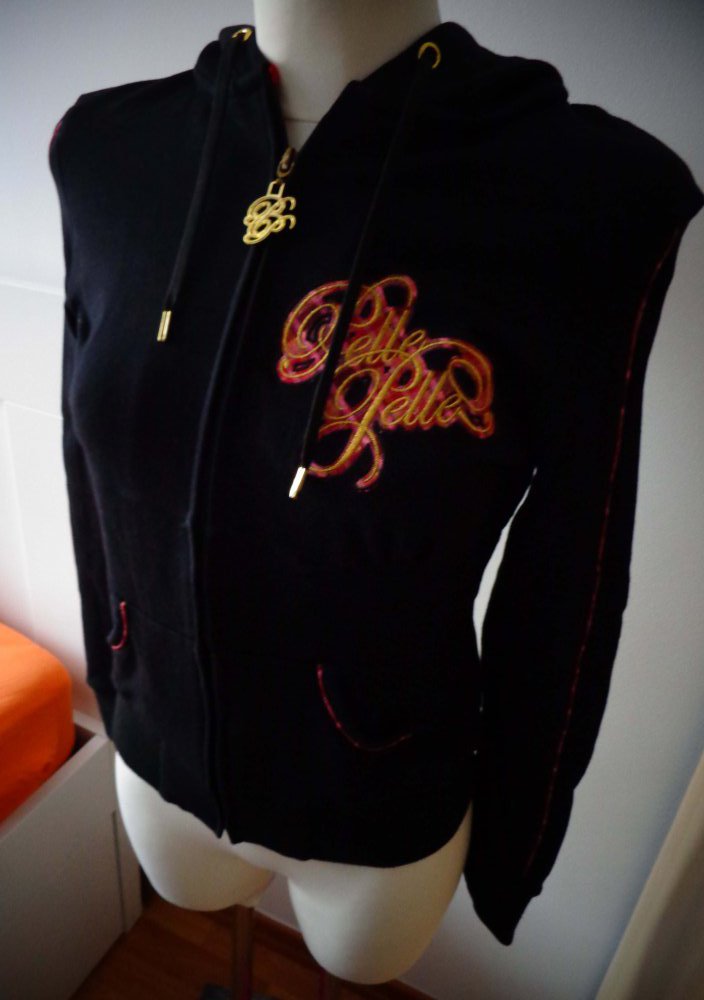 Ungetragene schwarze Sweatshirtjacke von PellePelle mit goldenen Reißverschlüßen, goldener Logo-Stickerei und rot-karierten abgesetzten Ziernnähten.