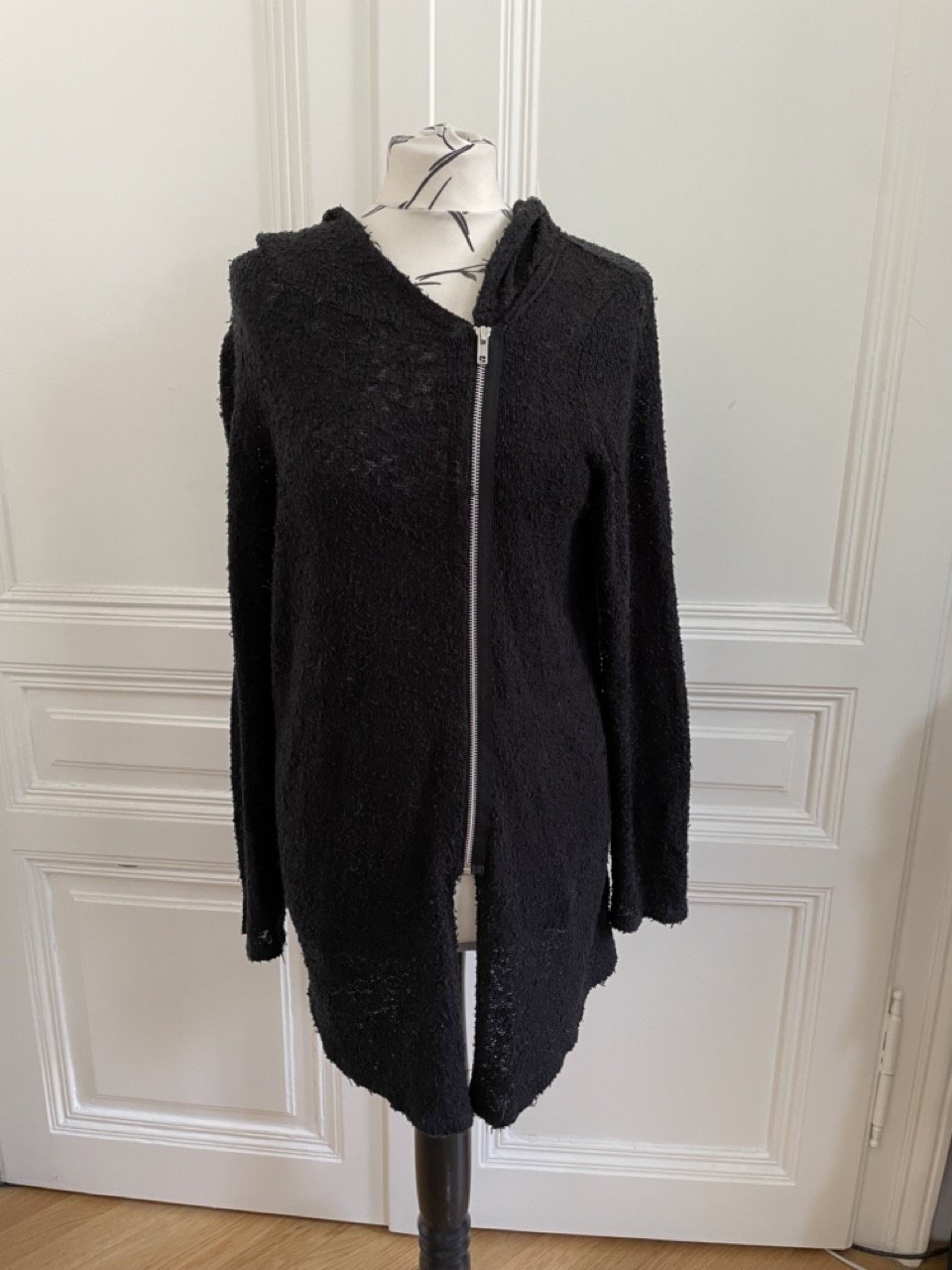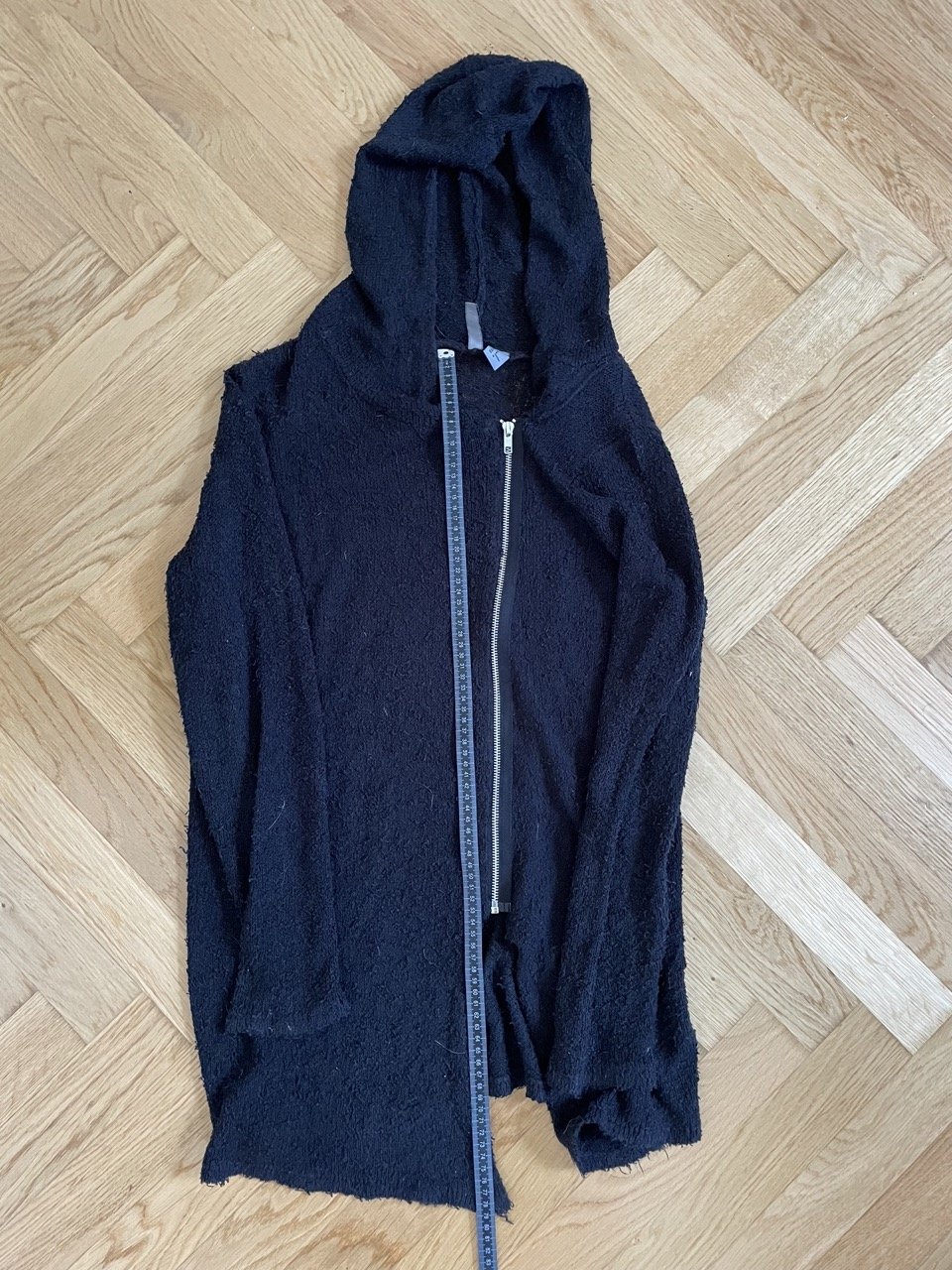 Schwarze Kapuzenjacke von H&M mit asymmetrischem Saum. Dieser läuft vorn etwas länger zu und wird mit einem schrägen und etwas seitlicher angeordneten Reißverschluss geschlossen. Der Stoff ist etwa aufgeraut und minimal transparent. Das sieht man auf den Bildern an der hellen Puppe ganz gut. Fand ich immer sehr grungig und cool :D