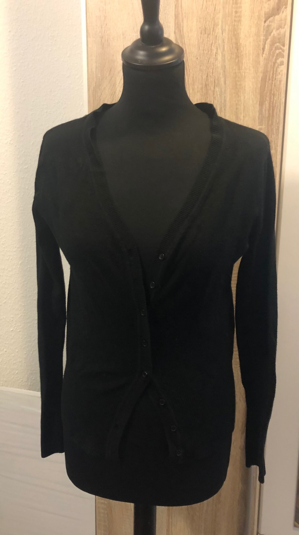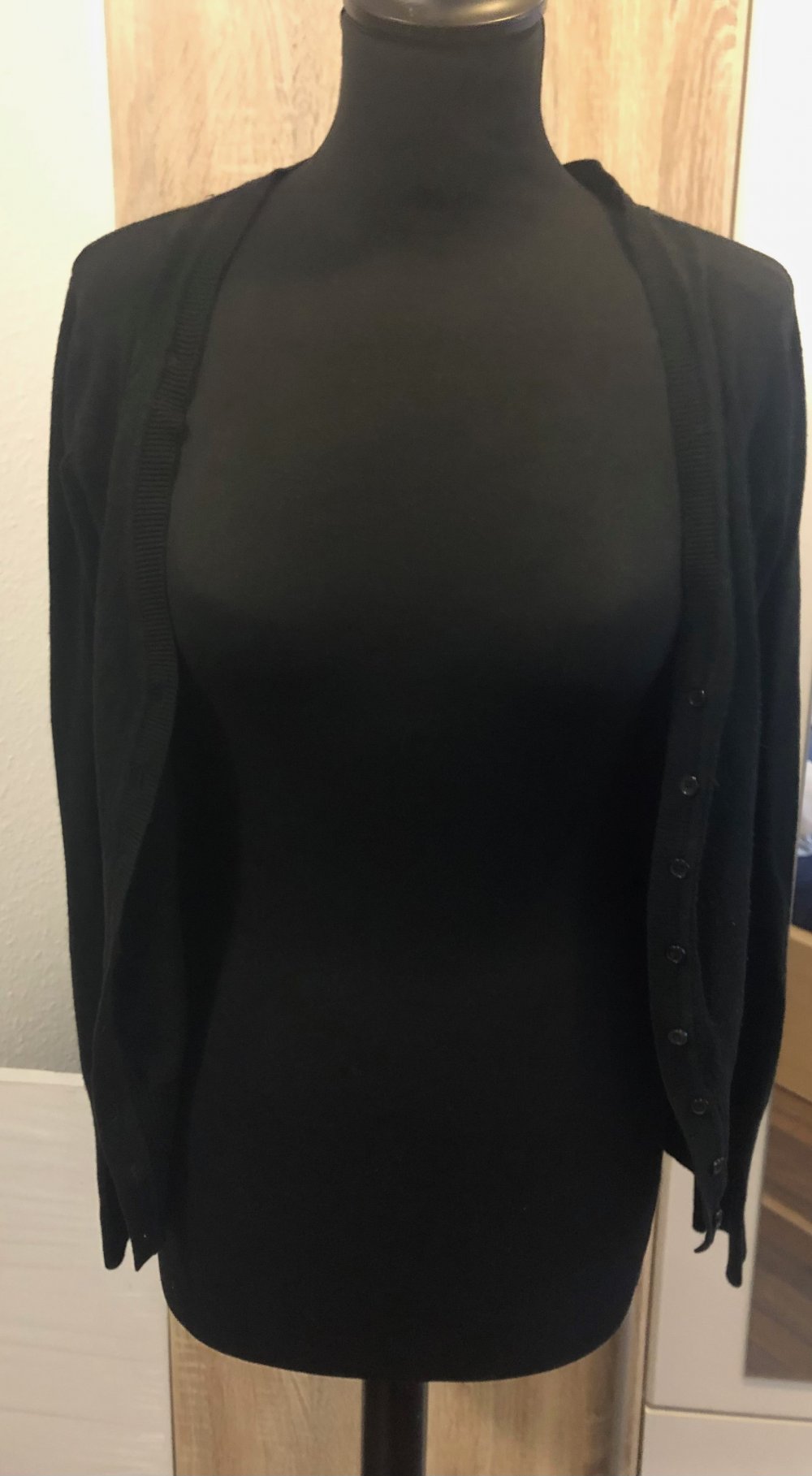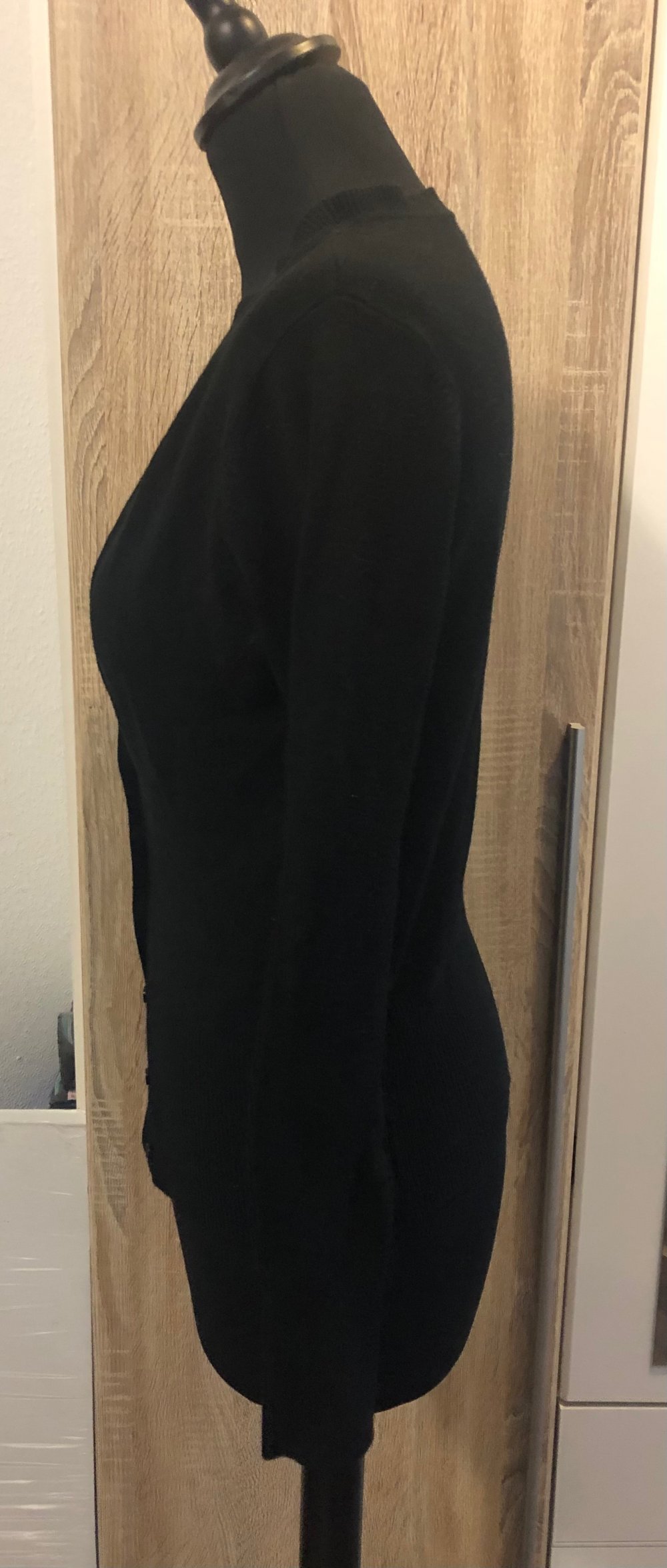 Tolles Strickjäckchen Gr. 38 aus Modal in schwarz. Leider war an der Schulternaht ein kleines Loch, welches ich aber so gut wie "unsichtbar" genäht habe (siehe Foto). Das gleiche Jäckchen habe ich auch noch in anthrazit in meinem Körbchen. Hatte ich gern für's Büro, ist mir aber, wie das andere, mittlerweile zu trist. Aber vielleicht Euch ja nicht?!