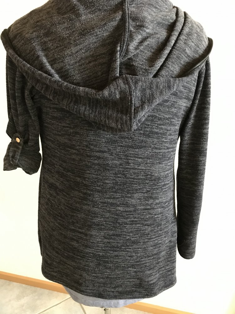 Sie ist schön lang geschnitten u hat Knopf zum Aufstecken der Ärmel
