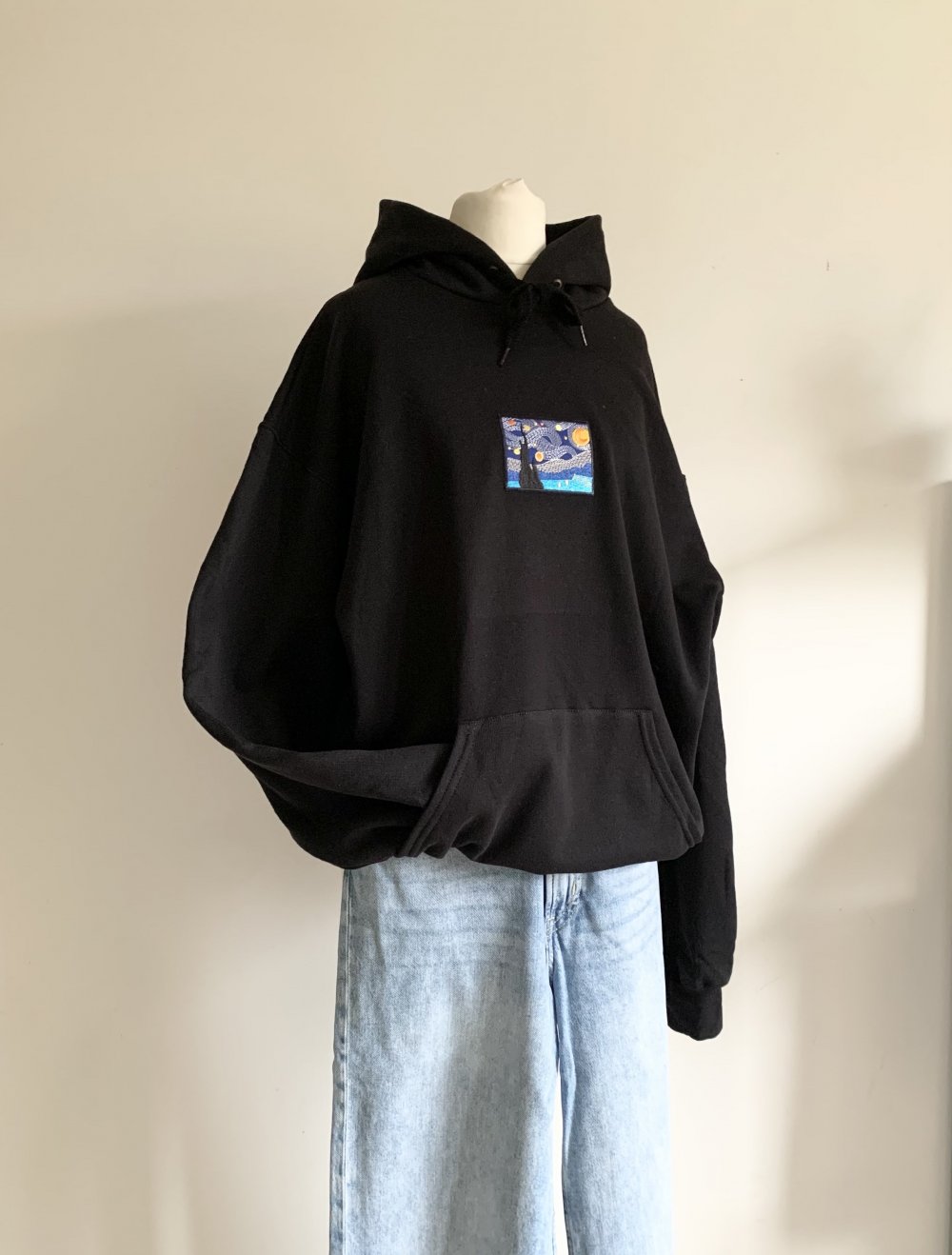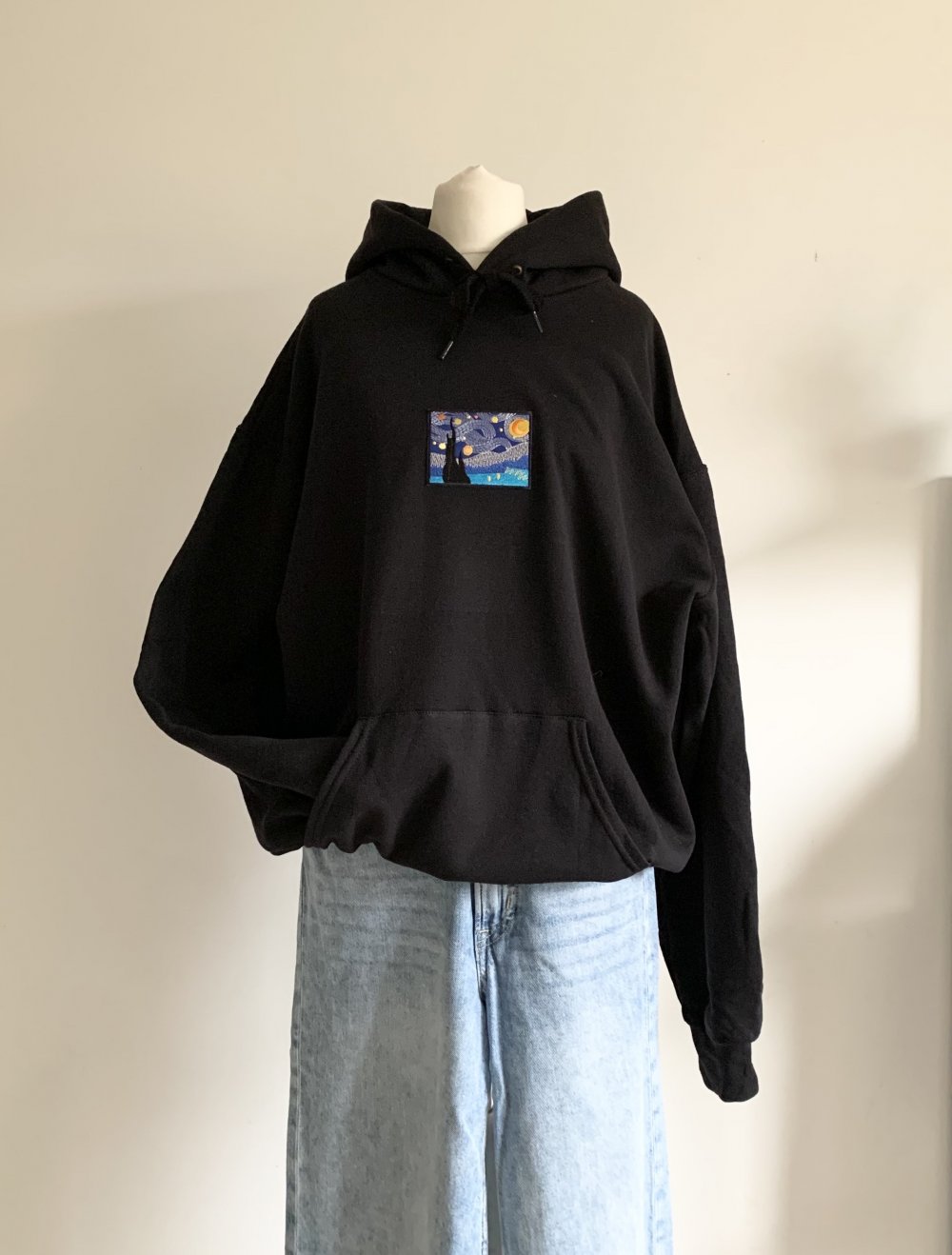schwarzer Hoodie oversized Van Gogh Sternennacht Stickerei unisex