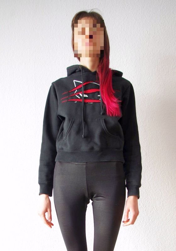 Eigenschaften: schöner Sweater mit Kapuze und Frontprint bzw Applikation (“Kratzspuren” und ein Katzengesicht), Fronttasche/ Känguruhtasche, lockerer etwas oversized Schnitt (zum Saum schmaler werdend wie bei Bomberjacken), je nach Körpergröße leicht cropped, lange Ärmel, fleeceartige Innenseite - perfekt für Festival/Party/Rave und Alltag