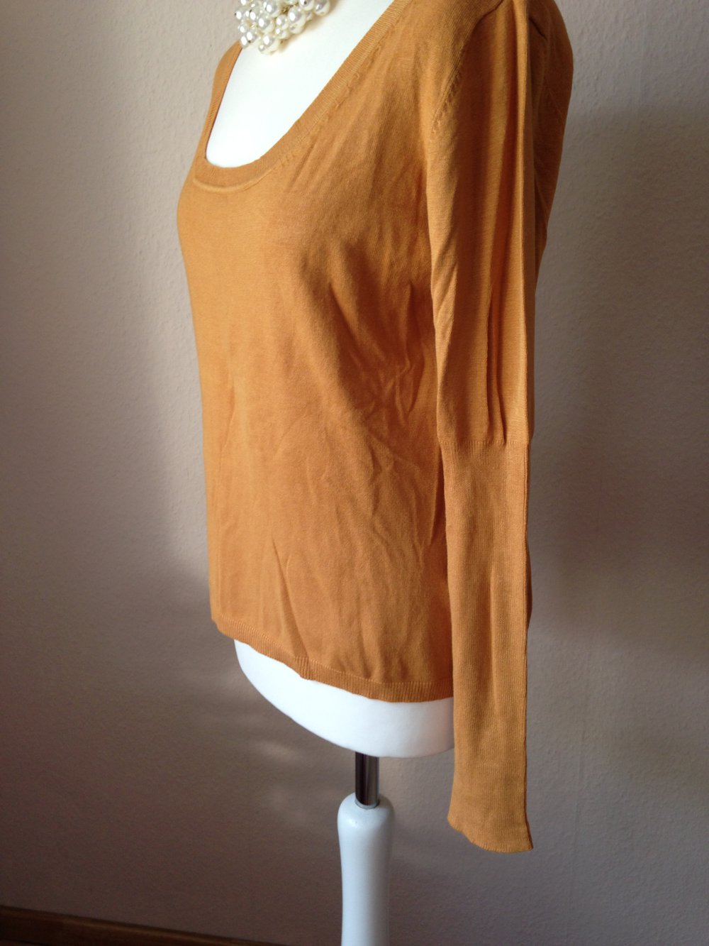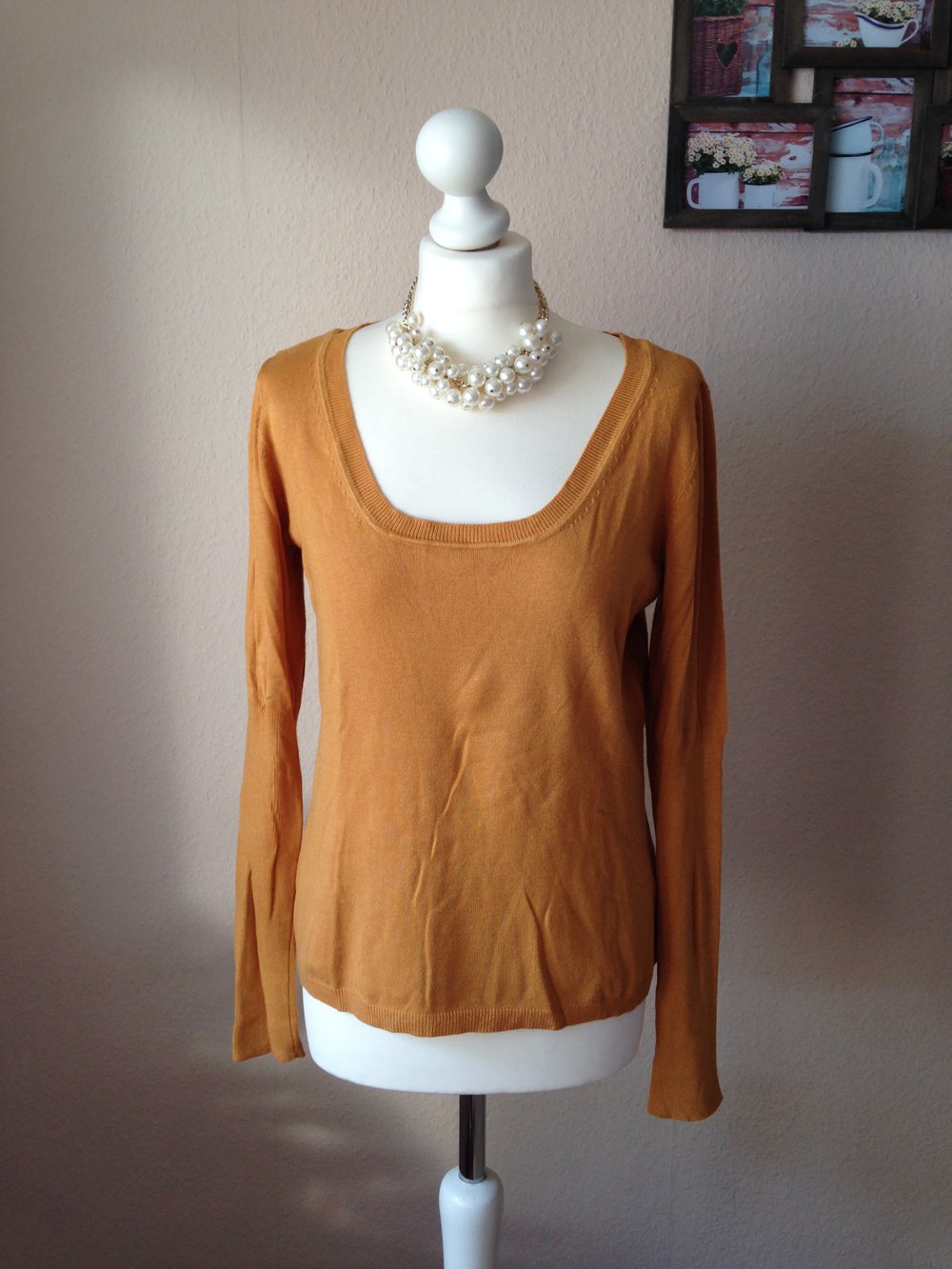 Gebe einen schönen senfgelben Pullover/Shirt ab. An den Unterarmen etwas enger geschnitten. Größe 38 bis 40.