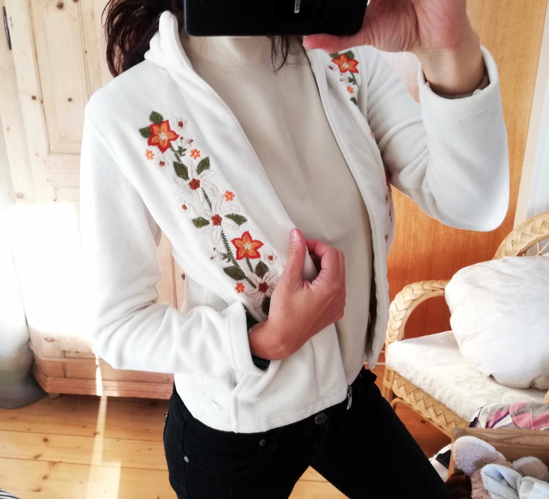 Fleecejacke Stickerei bestickt Blumen Ethno Folklore weiß bunt S 36 M 38