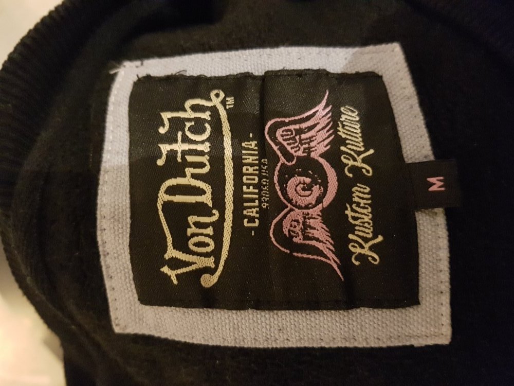Schwarzer Sweat-Pulli von Von Dutch mit schwarzer Logo-Applikation. Ausgefranste Búndchen, weiter kastiger Schnitt. Gr. M, nur einmal getragen