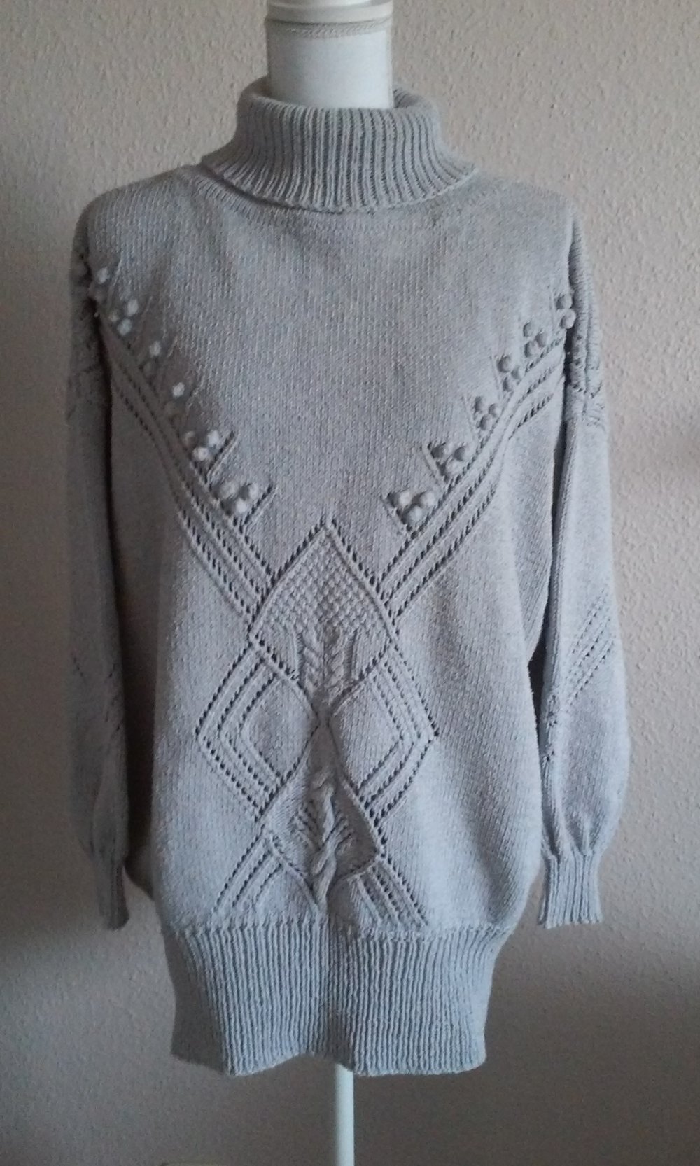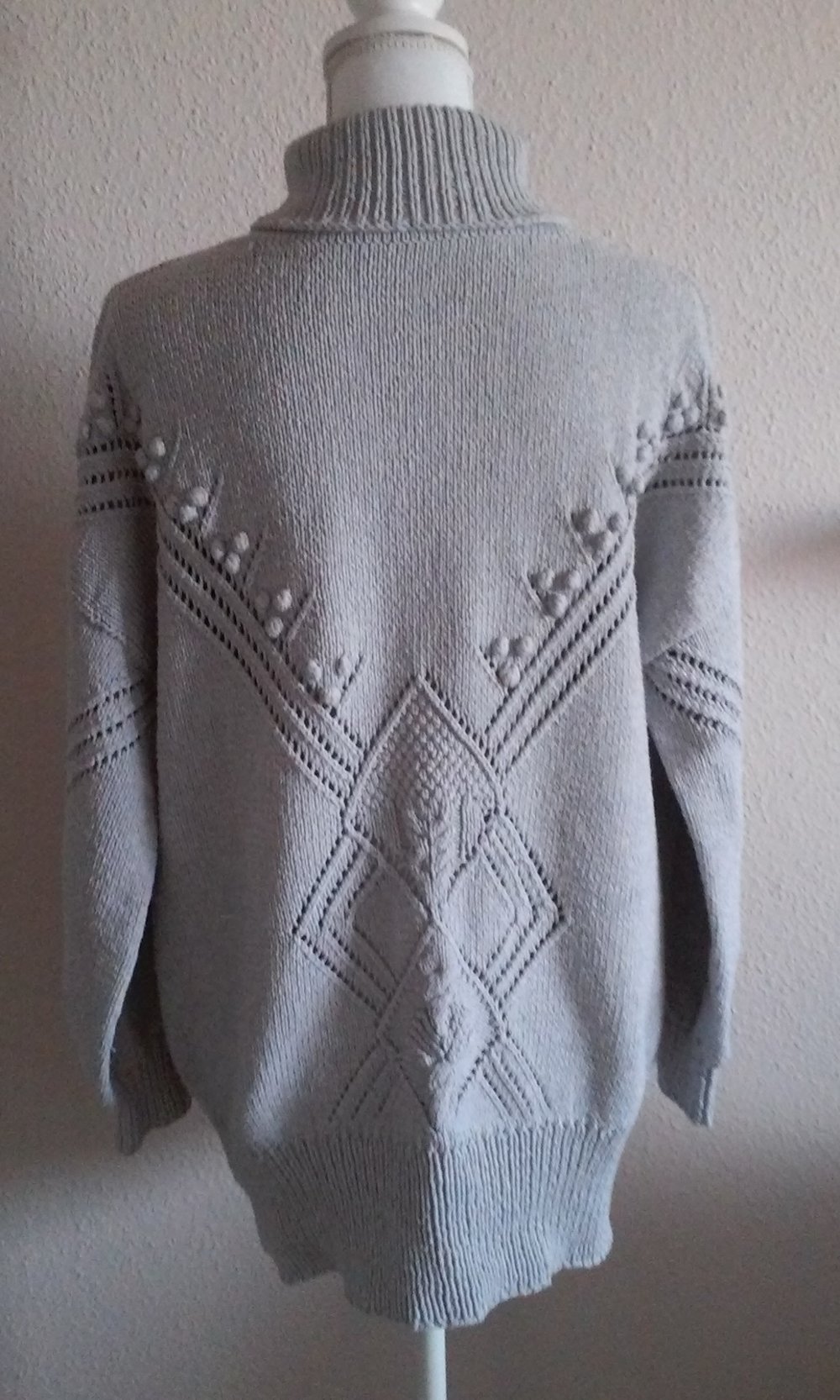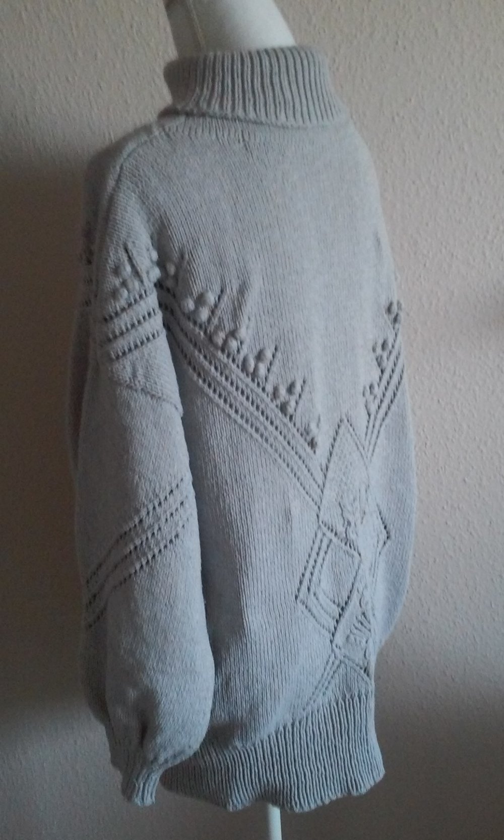 der Pullover ist mit Ajourmuster handgestickt in hellgrau, kann auf Grund des schönen Materials das ganze Jahr getragen werden