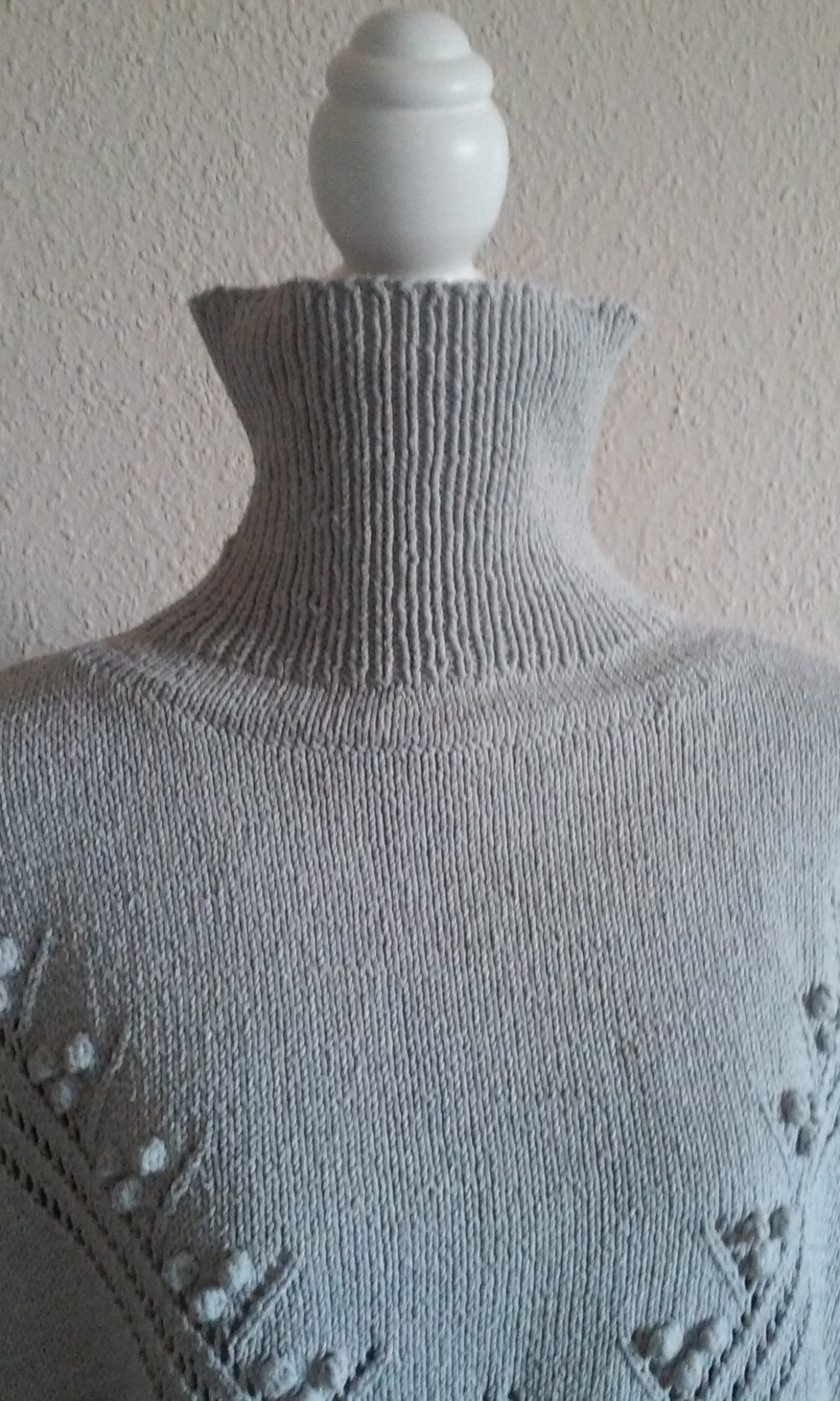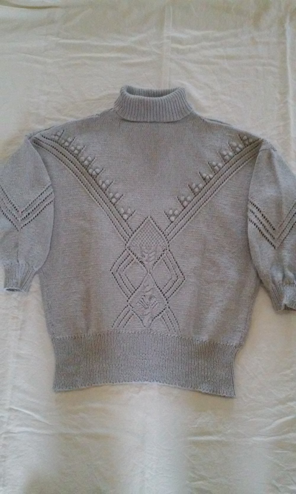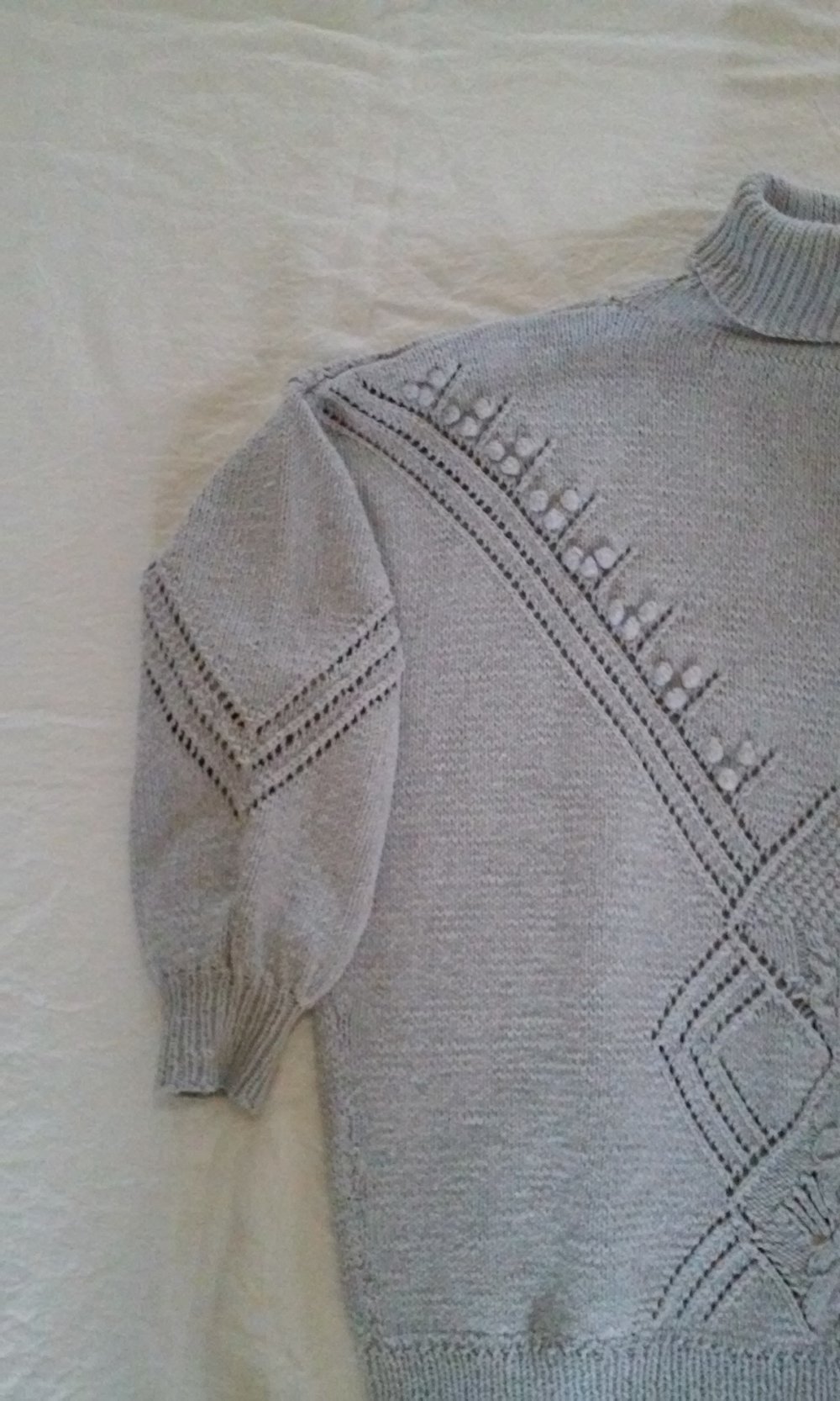 der Pullover ist mit Ajourmuster handgestickt in hellgrau, kann auf Grund des schönen Materials das ganze Jahr getragen werden