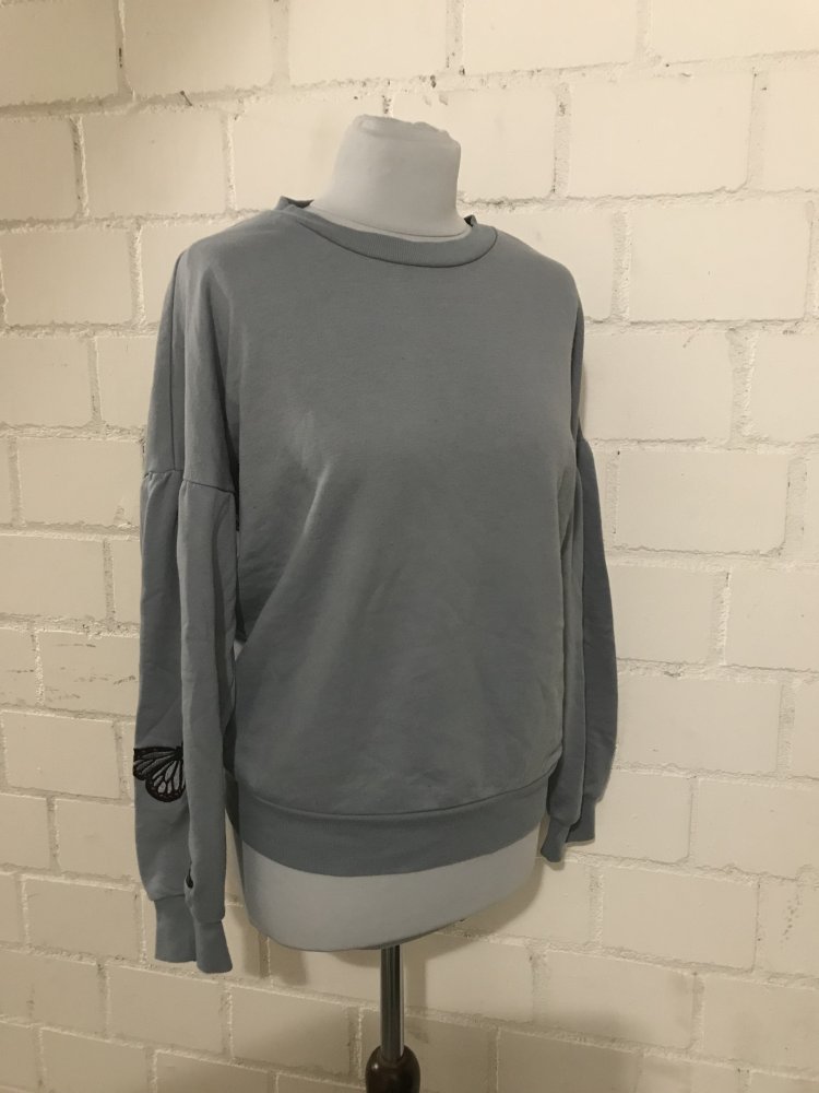 Kleine Schmetterling Stickerei am rechten Ärmel. Leichte Ballonärmel. Generell leichtes Pilling, siehe Bilder 4 und 5. Nach der Größeneinteilung hier, würde sagen, dass es eine kleine L ist. Eher so 40/42.