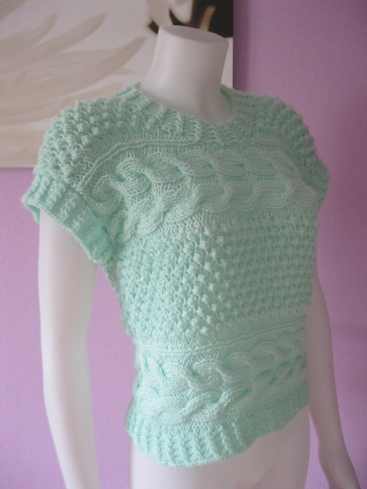 Gestrickter, kurzärmliger Pulli in aufwendigem Perisanier-Muster und quergestricktem Zopfmuster.