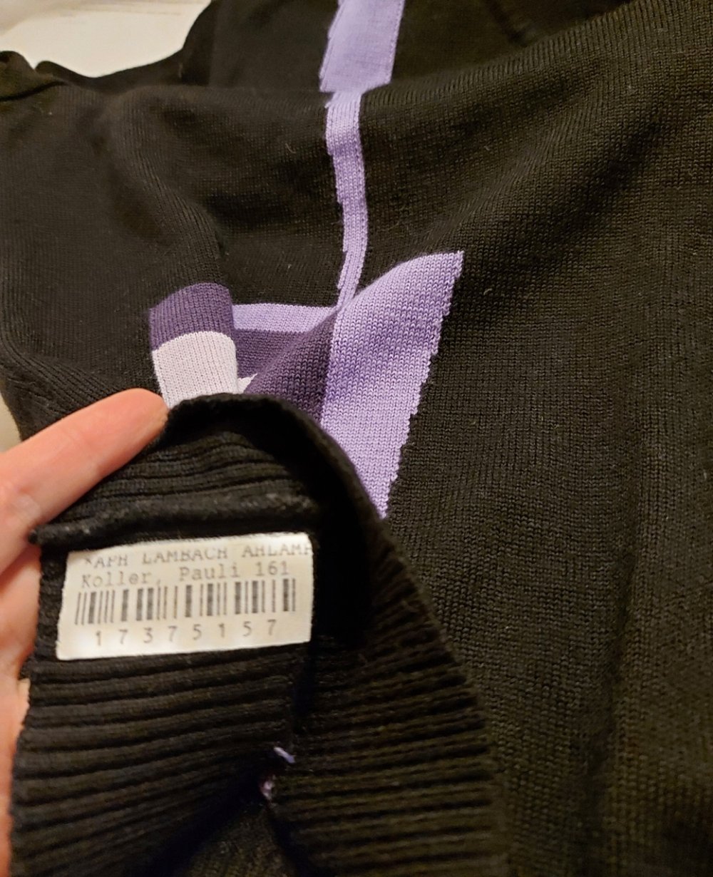 *) Der Pullover in schwarz hat geometrische Muster in flieder und lila aufzuweisen.