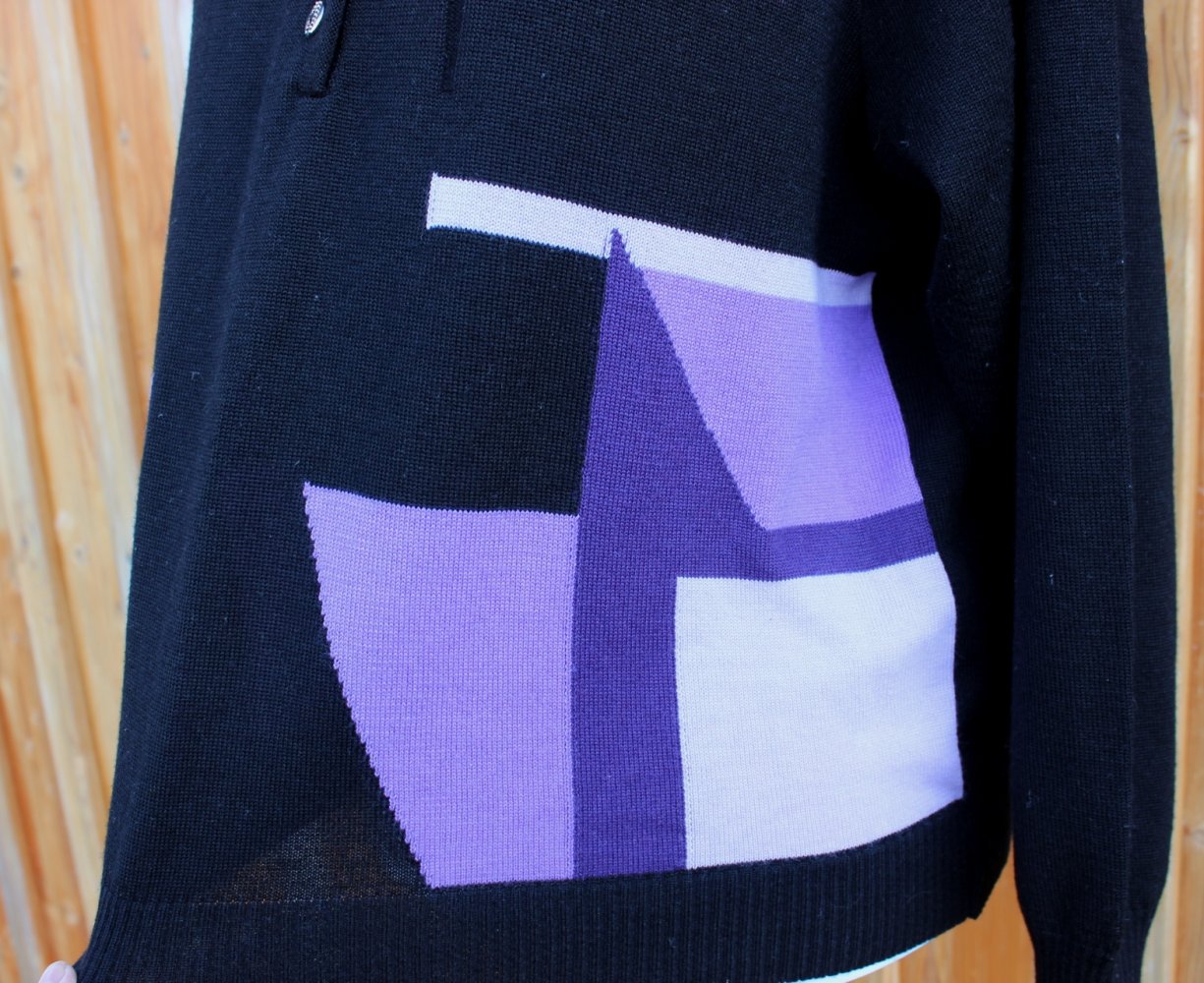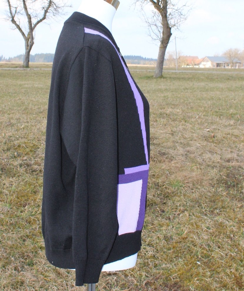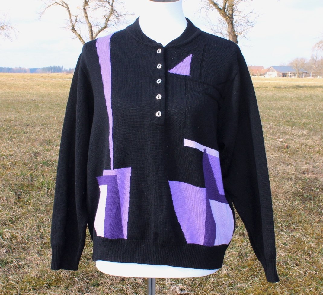 schwarzer True Vintage Pullover mit geometrischem Muster in lila, ca. Größe 50 oder Oversized Look