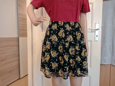 *) Der Rock ist aus einem schwarzen Stoff gefertigt,
