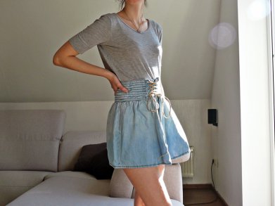 Ausgestellter Jeansminirock von Fishbone/ New Yorker. Er passt einer 32, 34 und 36 (eventuell auch 38) und die Bundweite kann über die Schnürung angepasst werden.