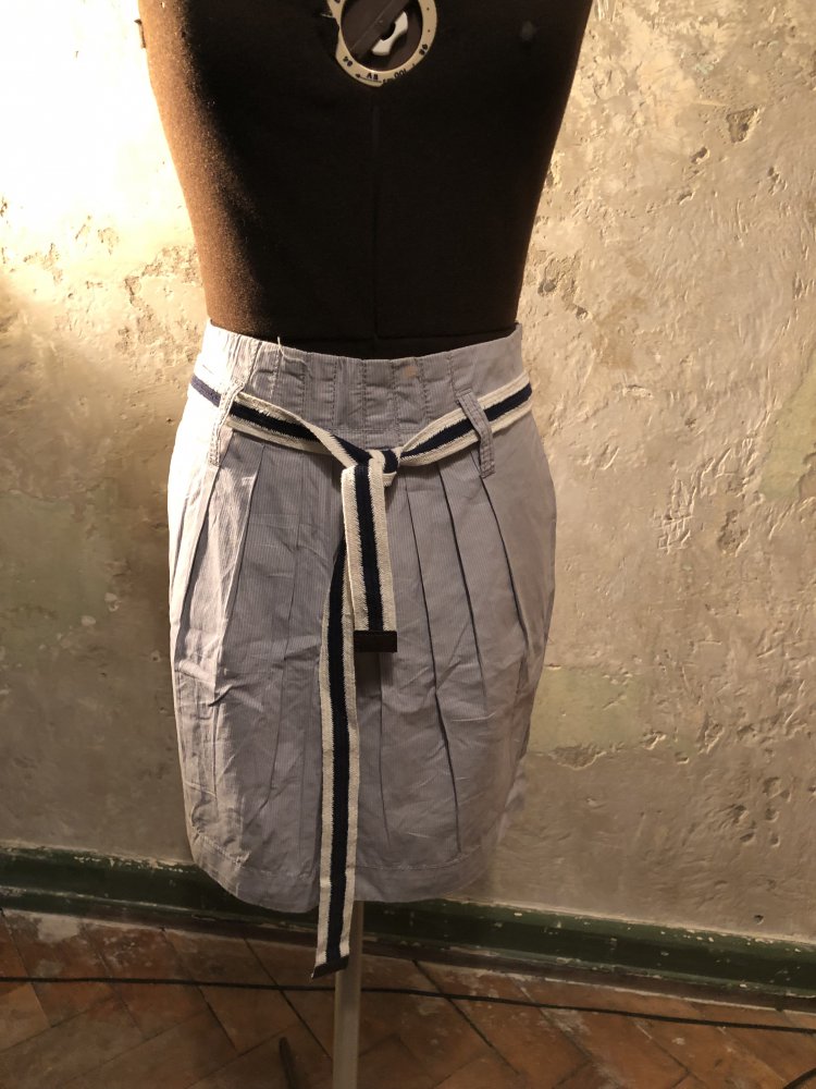 Hellgrauer Rock mit weißen Längsstreifen und Gürtel