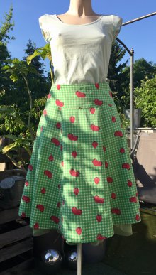 Zum Vergleich: die Puppe hat Größe XS/S, ihr ist der Rock etwas zu groß und deshalb rückwärtig mit einer Klammer fixiert.