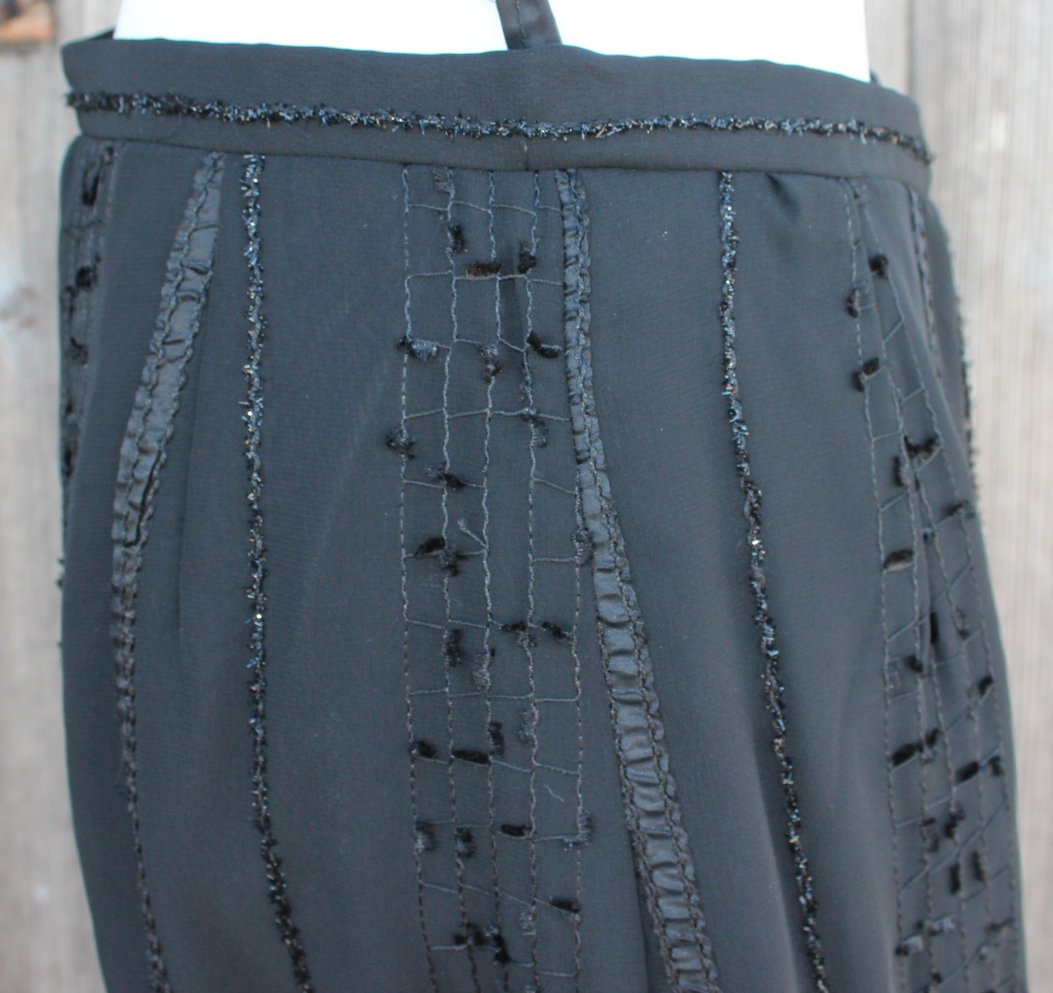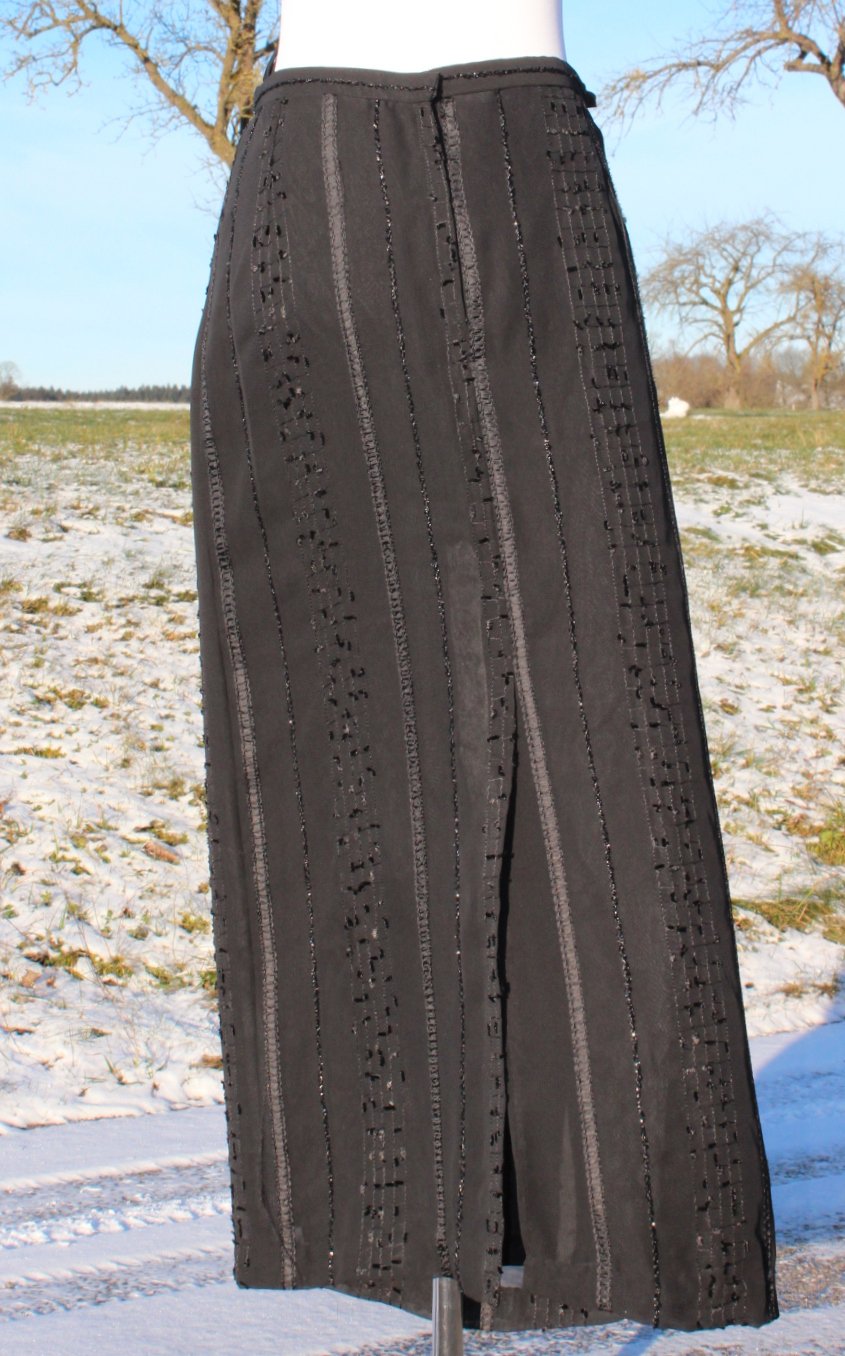 True Vintage, Vintagerock, schwarz, Gothic, Borte, Streifen, allblack, stripes, Taillenrock, Highwaist, Maxirock, gerader Rock, DIY, Unikat, Einzelstück