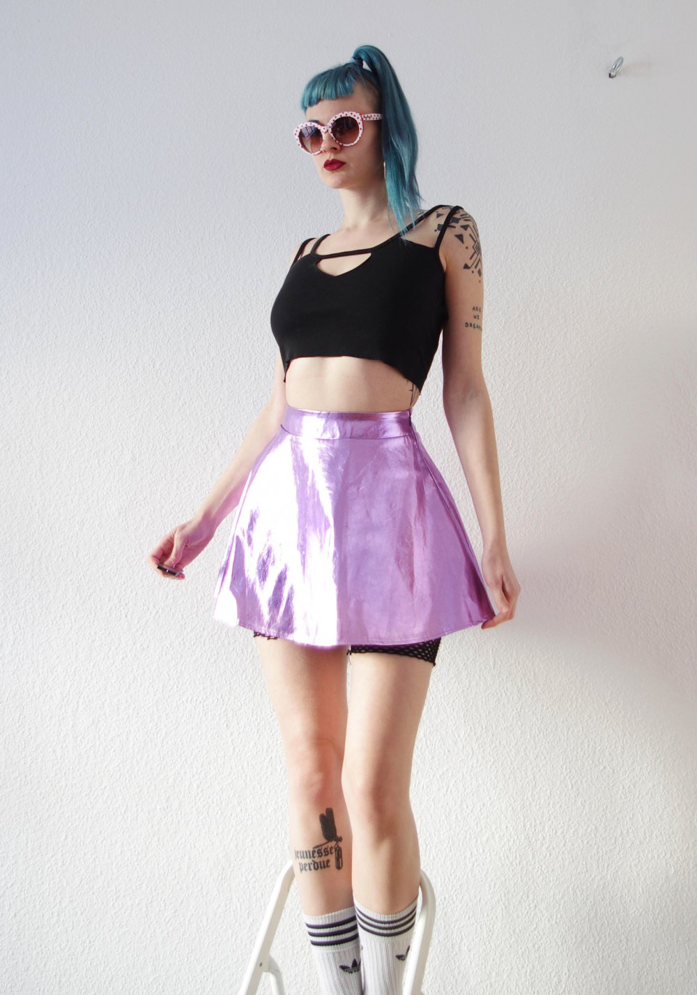 Eigenschaften: glänzender metallic Minirock in A-Linie (fast Tellerrock/Skaterrock), highwaist, seitlich versteckter Reißverschluss, hat tollen Stand & wunderschönen Glanz - perfekt für auffallende Outfitkombis, Alltag, Party/Rave, Festival, Karneval