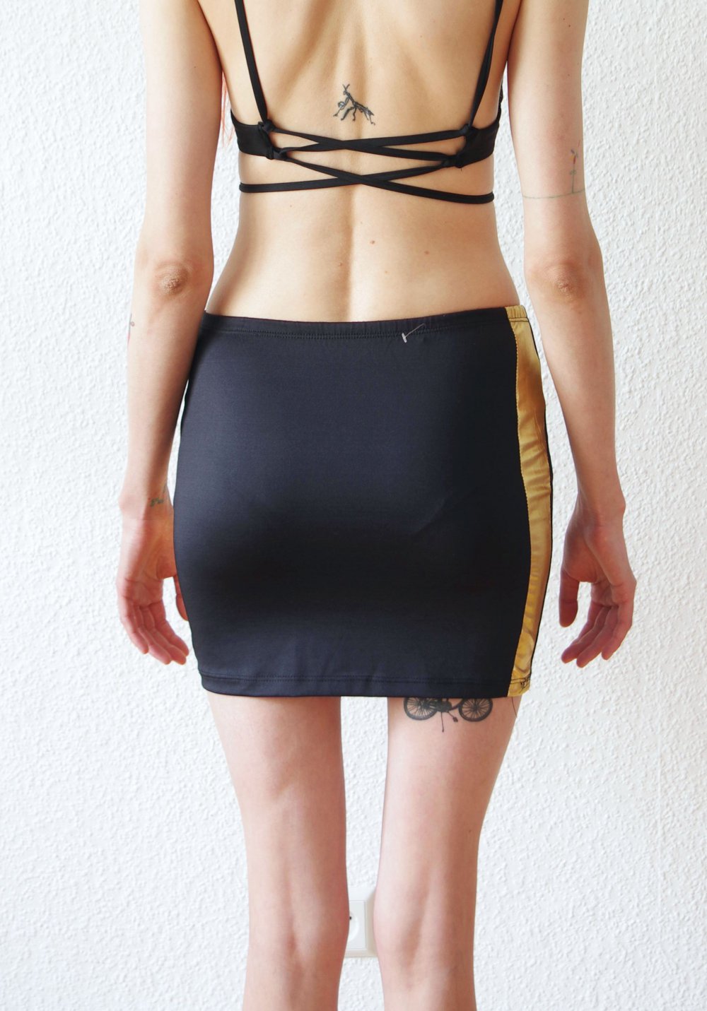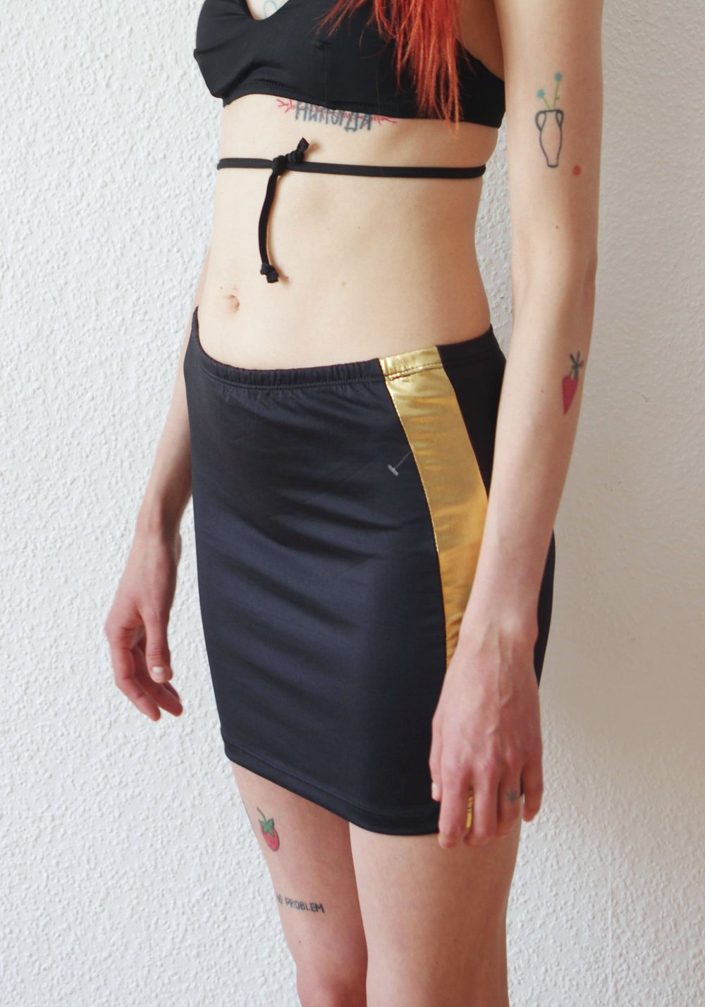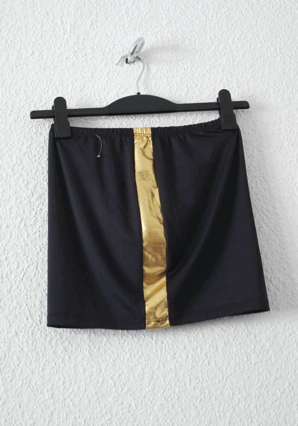 Eigenschaften: super stretchiger, enganliegender Minirock, Tubeschnitt, leicht glänzend mit seitlichem Metallic-Stoff-Einsatz, kann highwaist oder hüftig getragen werden, Stretchbund - perfekt für Alltag, Party/ Rave/ Festival