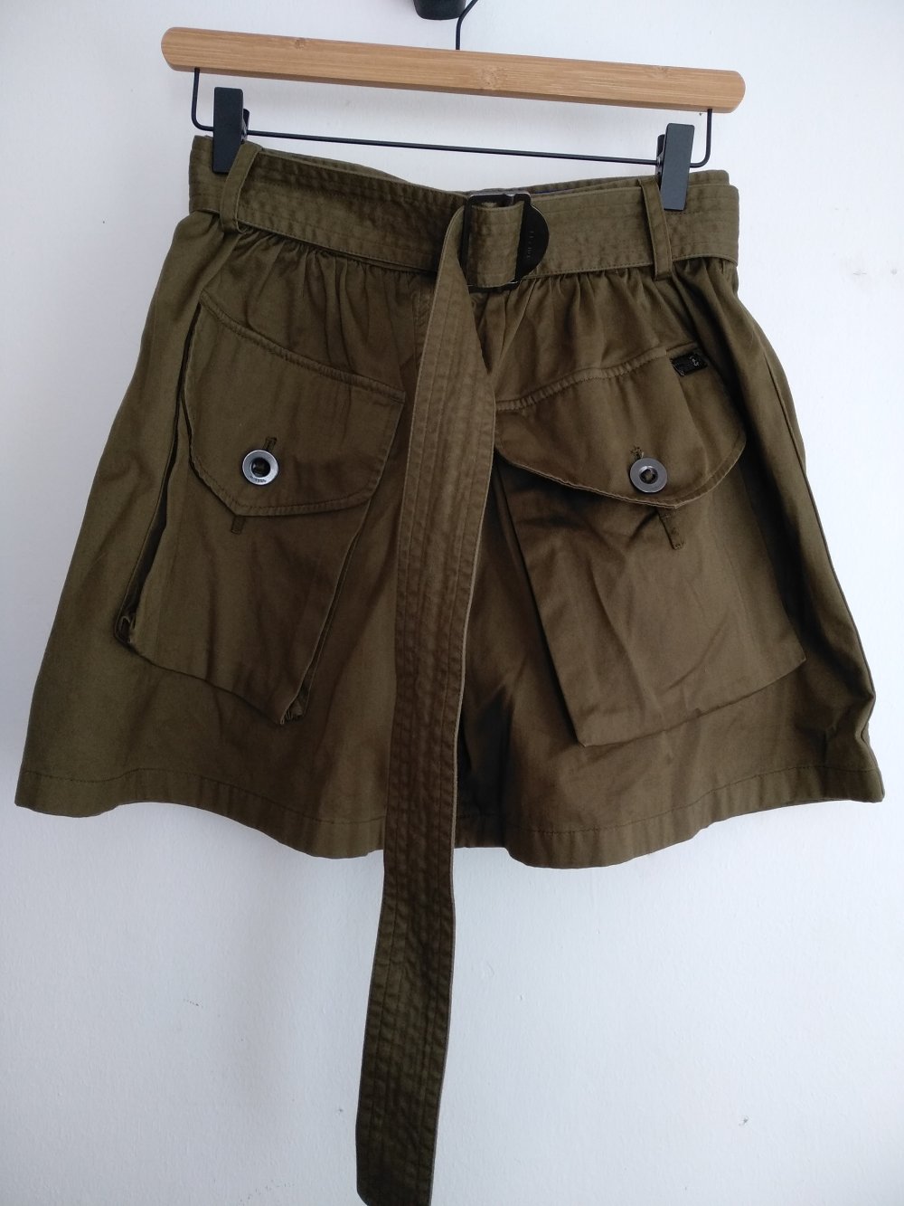 Ausgestellter A-Linien-Rock im Utility-Stil. Sehr satter, leuchtender Grünton, eher oliv. Taillenbreite 35cm