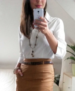 Schicker Caramel Brauner knielanger Taillenrock mit zwei Vordertaschen von H&M. Hinten läßt sich der Rock mit einem Reisverschluß offen und zusätzlich sind noch zwei Pseudotachen am Hintern. Der Rock lässt sich super mit einem Gürtel tragen und kann ihn gut zu schlichten sowie bunten Sachen kombinieren.