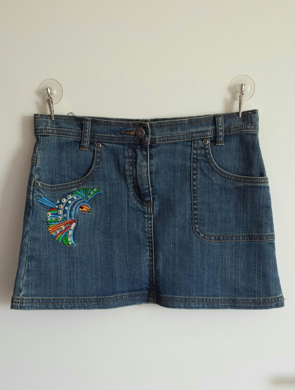 Gerade geschnittener Jeansrock mit gesticktem Papagei und Pailletten, ca 31cm lang. Größe 32