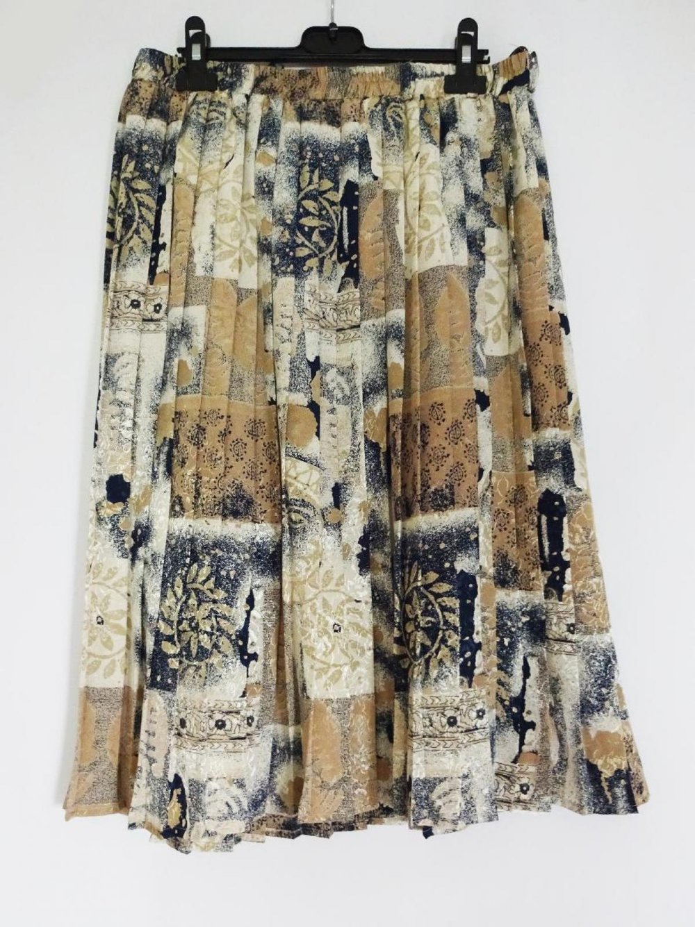 Gemusterter Faltenrock aus den frühen 90er Jahren in Erdtönen und mit Gummibund. Der Rock hat einen eingenähten Unterrock. Das Obermaterial ist recht dick und robust und teilweise mit goldenen, feinen Stickereien versehen, was dem Rock einen dezenten Glanz verleiht.