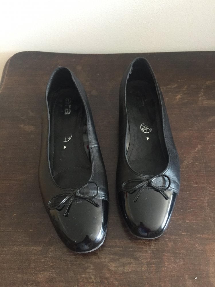 Schwarze Ballerinas von Ara mit kleinem Absatz ca. 2cm hoch. Mit abgerundeter Lackspitze