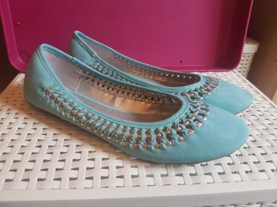 Hübsche Ballerinas von Funky Shoes in türkis, Größe 40. Vorne haben sie ein Flechtmuster, in das silberne Details eingewoben sind. Nur 1x getragen, neuwertig.