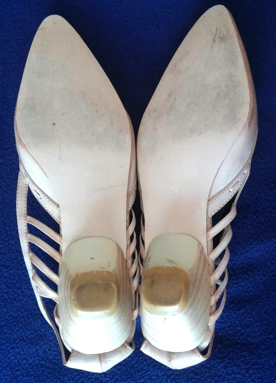 mit offenen Seitenpartien. Die Farbe Beige. Leicht hochgezogene Ferse. Gold Innenausstattung. Absatzhöhe ca. 3 cm. Wurde nur 1 Mal getragen. An linken Schuh von innen Seite die Naht aufgegangen, deshalb als Schnäppchen zu haben. Aber es stört nicht zum Tragen, weil außen ist noch fest und sieht man es gar nicht. Farbe Beige von Betty May. Sie sind wunderschön.